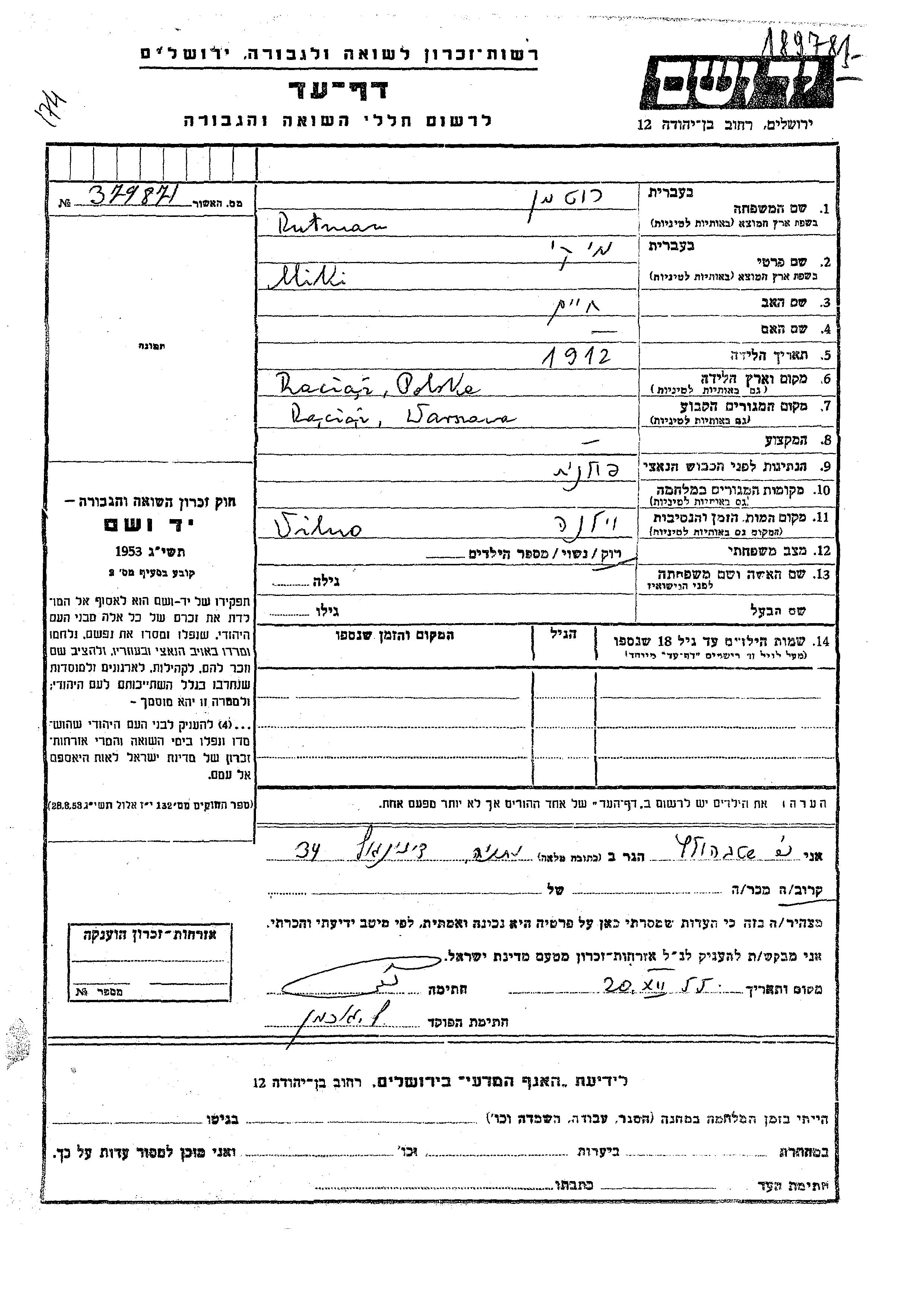Rutman Rotman Miki 1912 Warsaw, Poland Page of Testimony