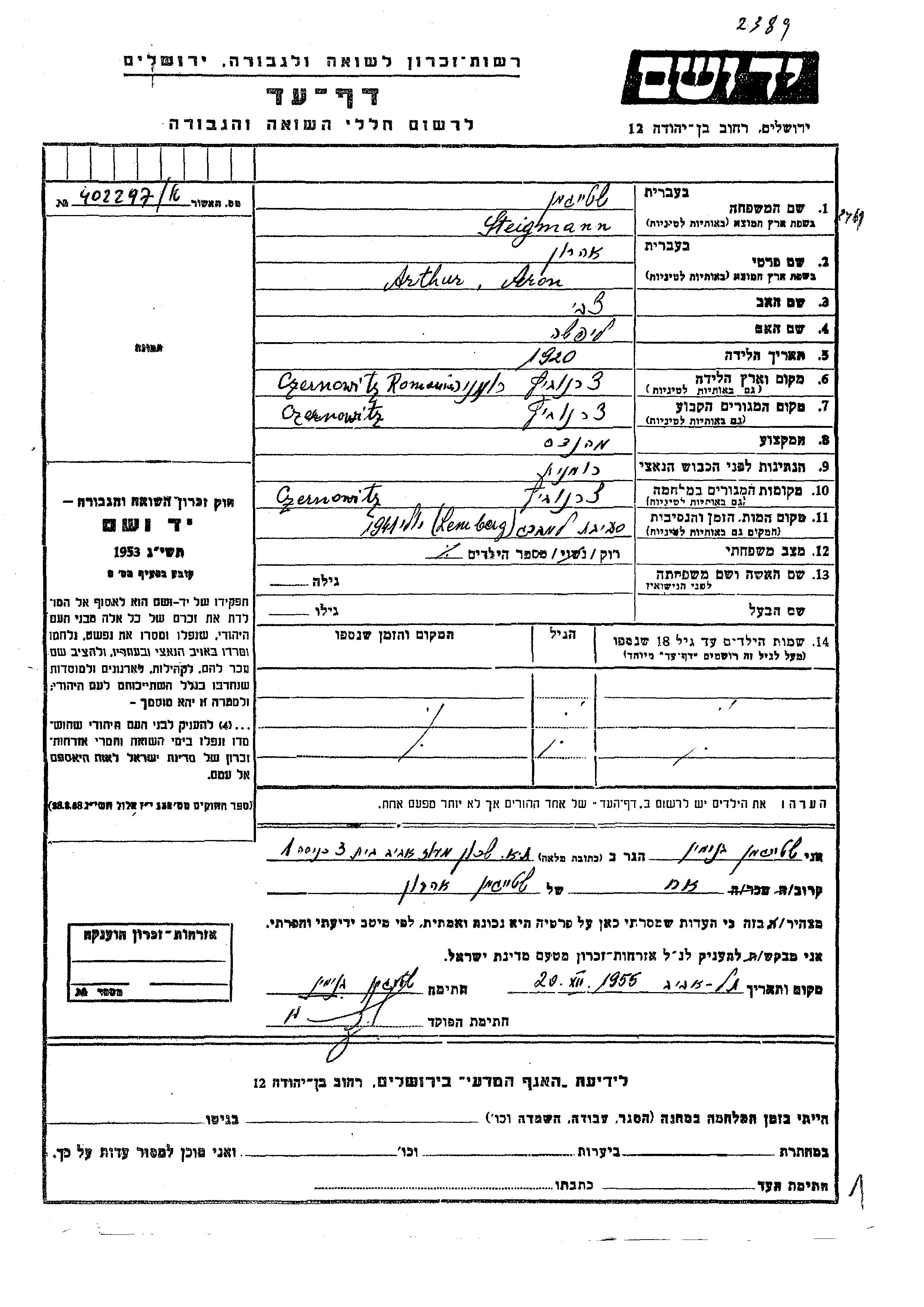 Arthur Aron Steigmann was born in Czernowitz, Romania, 1920 to Tzvi and Lifsha. He was an engineer and single. Prior to WWII he lived in Czernowitz, Romania. During the war he was in Czernowitz, Romania. Arthur Aron was murdered in the Shoah. Place of death: Lemberg, Poland, 07/1941.