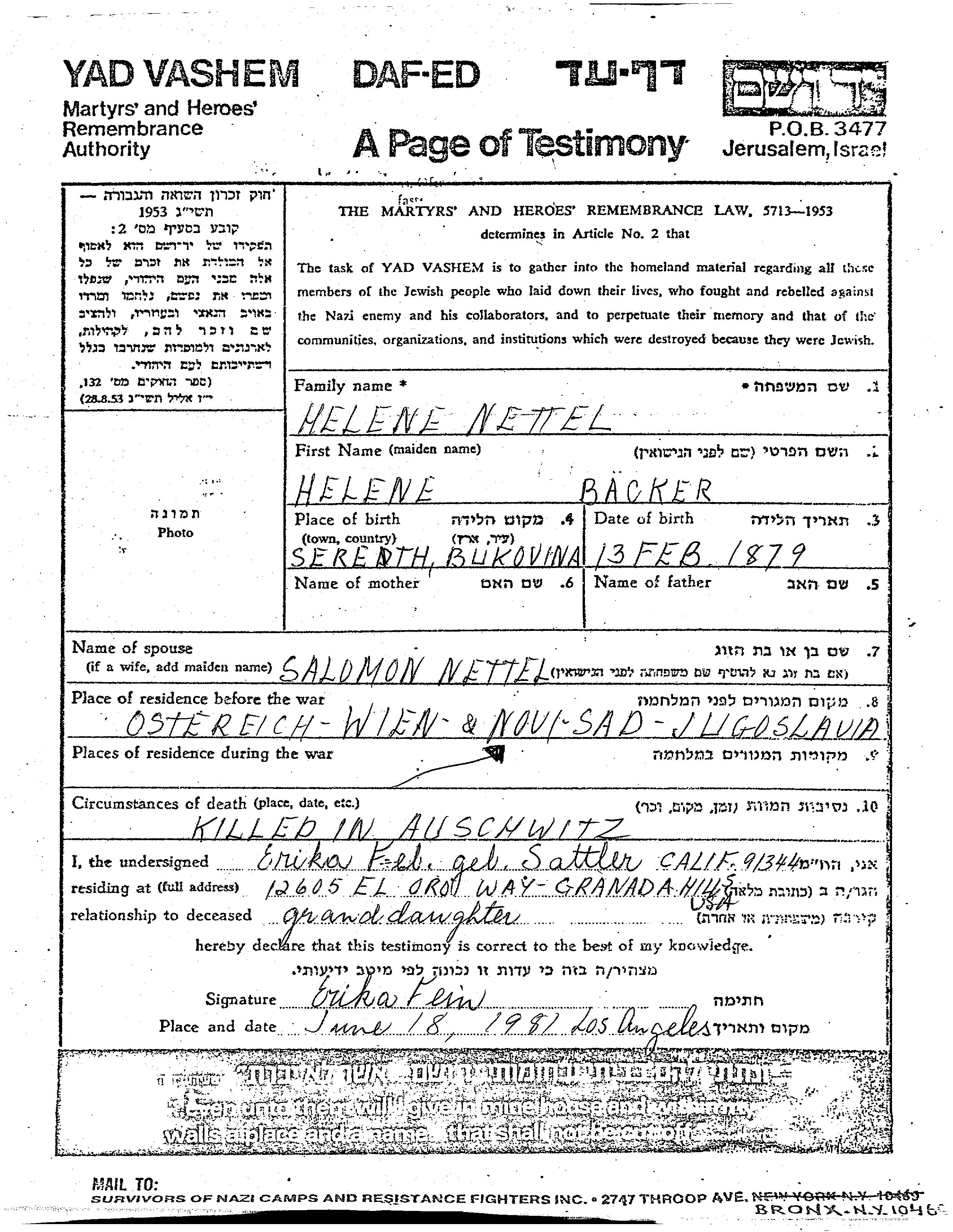 Nettel Helene 1879 Novi Sad, Yugoslavia Page of Testimony
