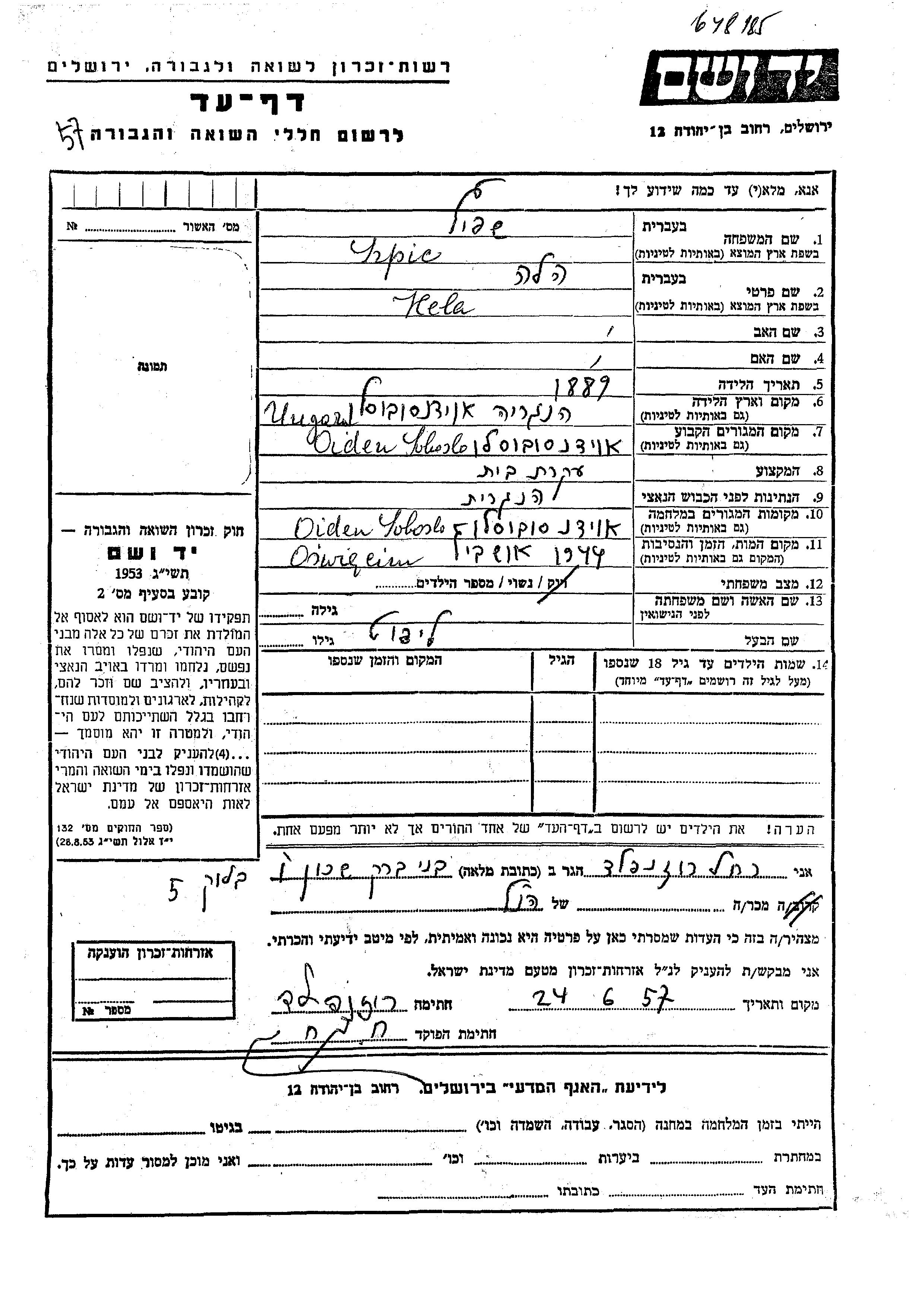 Szpic Hela 1889 Oiden Soboslo, Hungary Page of Testimony