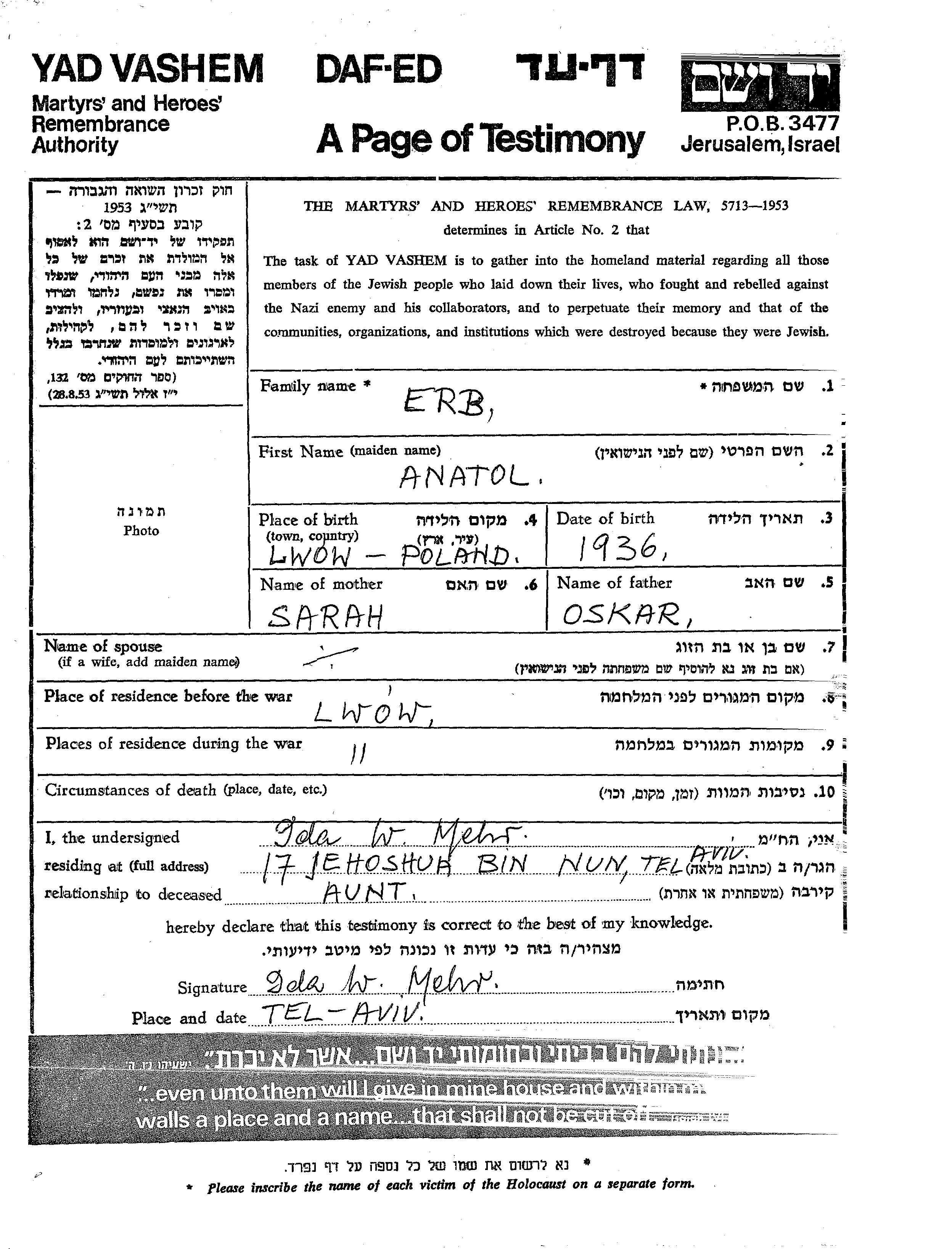 Erb Anatol 1936 Lwow, Poland Page of Testimony