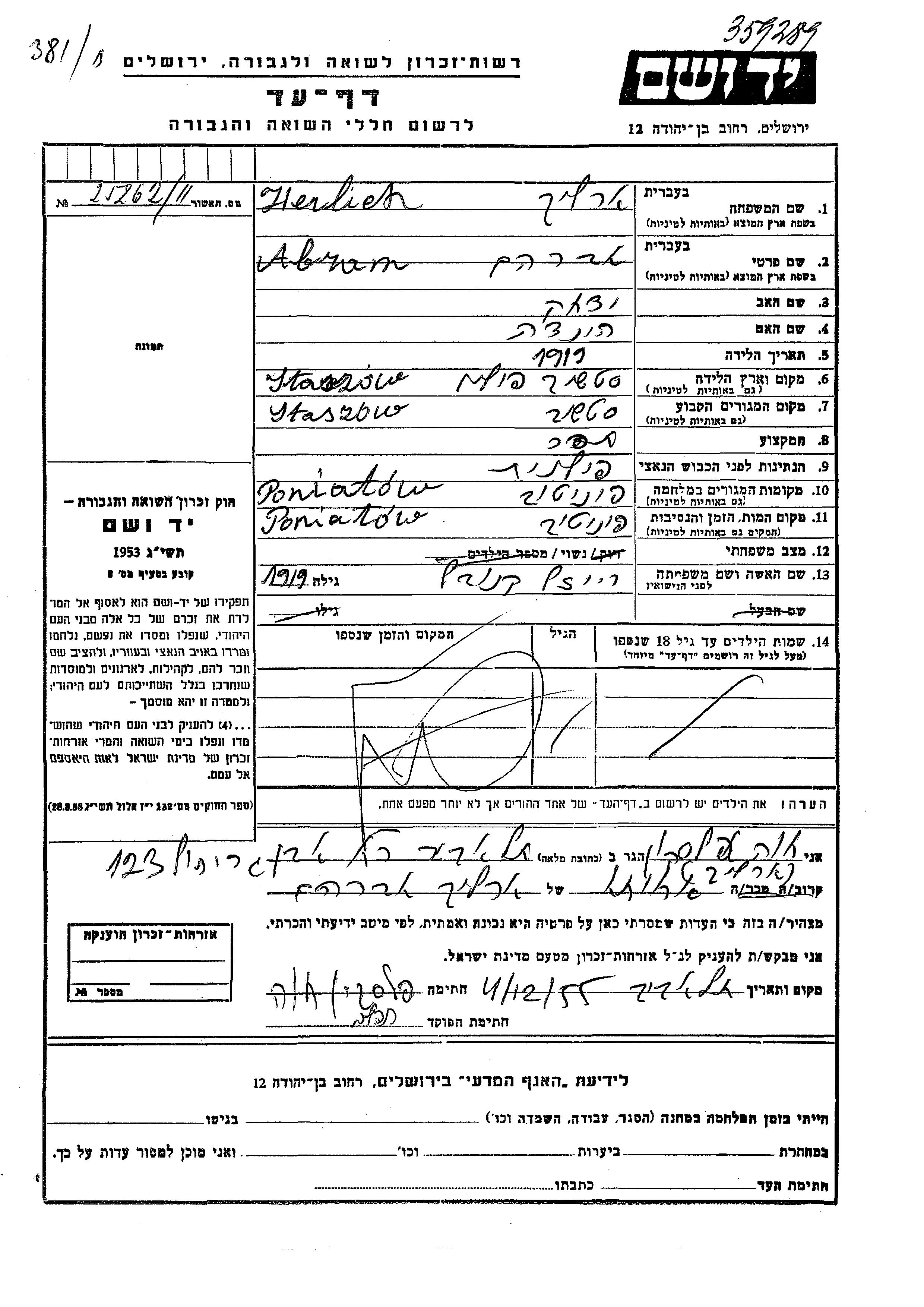 Herlich Erlikh Abram 1919 Staszow, Poland Page of Testimony