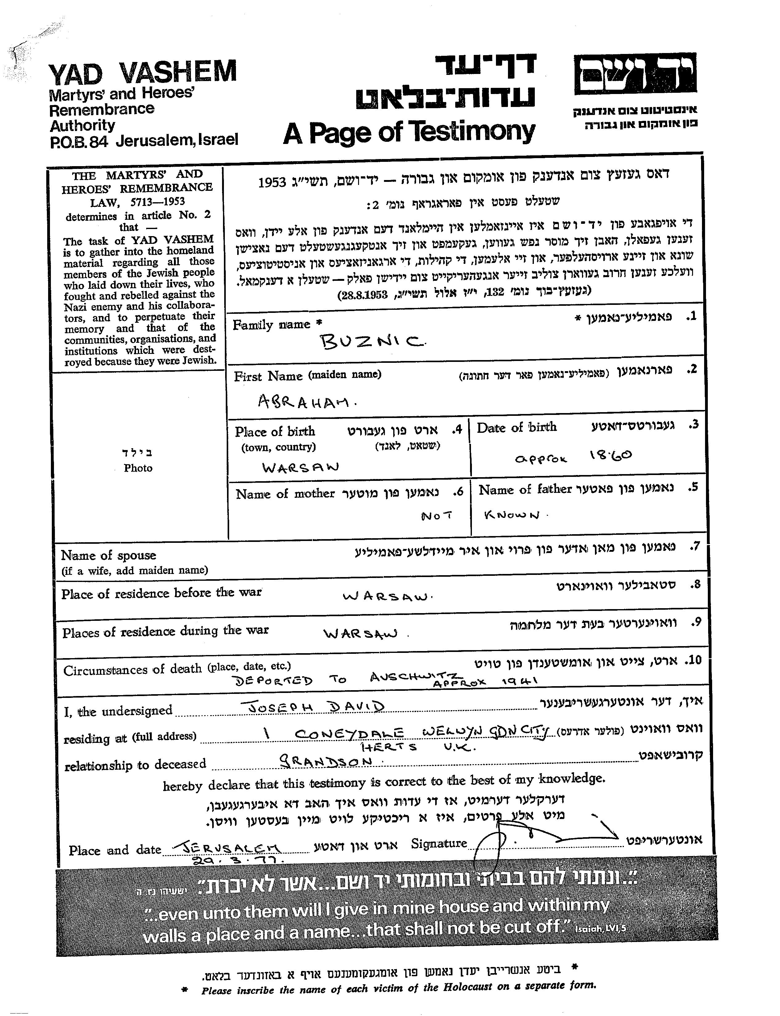 Buznic Abraham 1860 Warsaw, Poland Page of Testimony