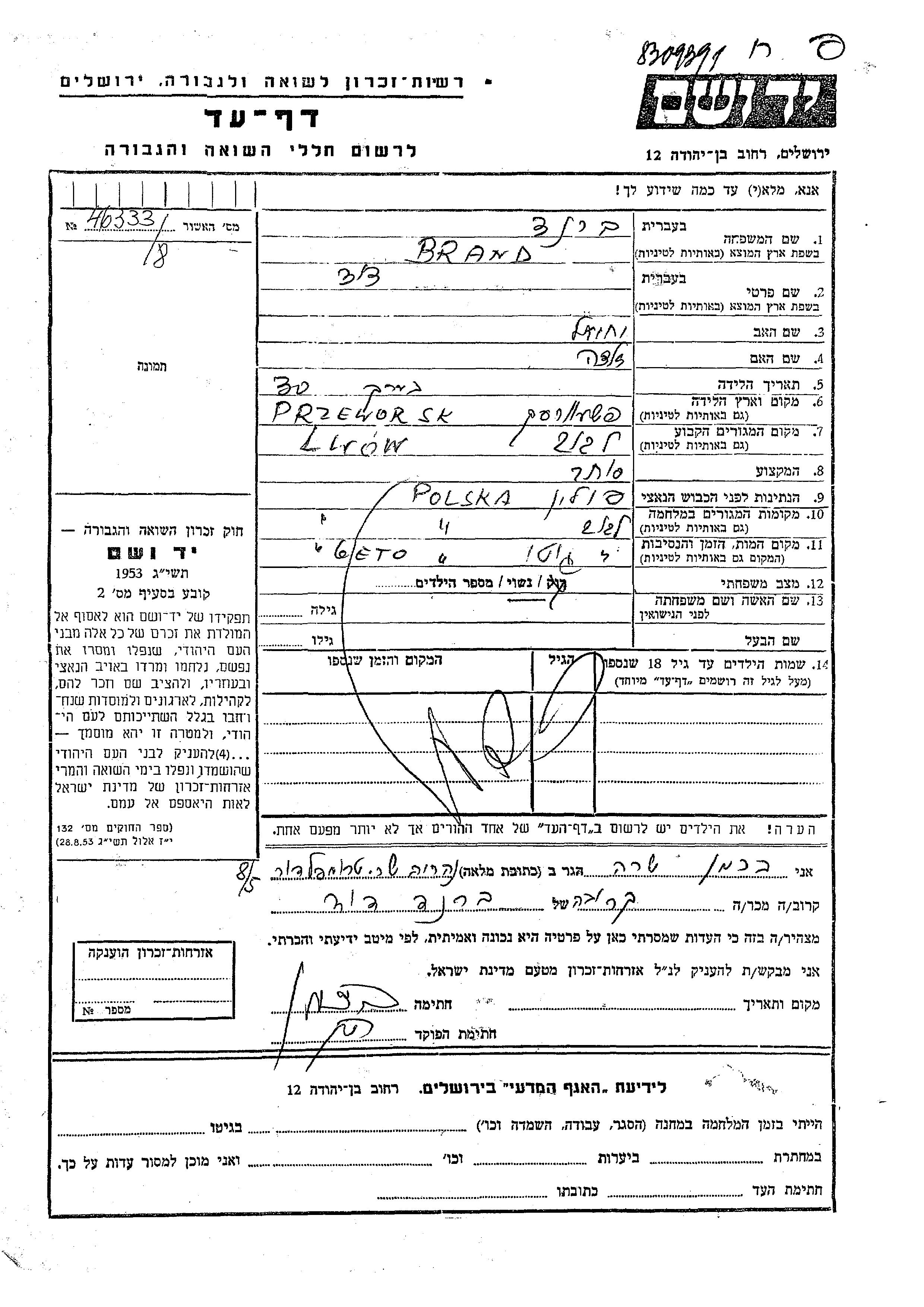 David Brand was born in Przeworsk, Poland to Yekhiel and Zelda. He was a merchant and married. Prior to WWII he lived in Lwow, Poland. During the war he was in Lwow, Poland.