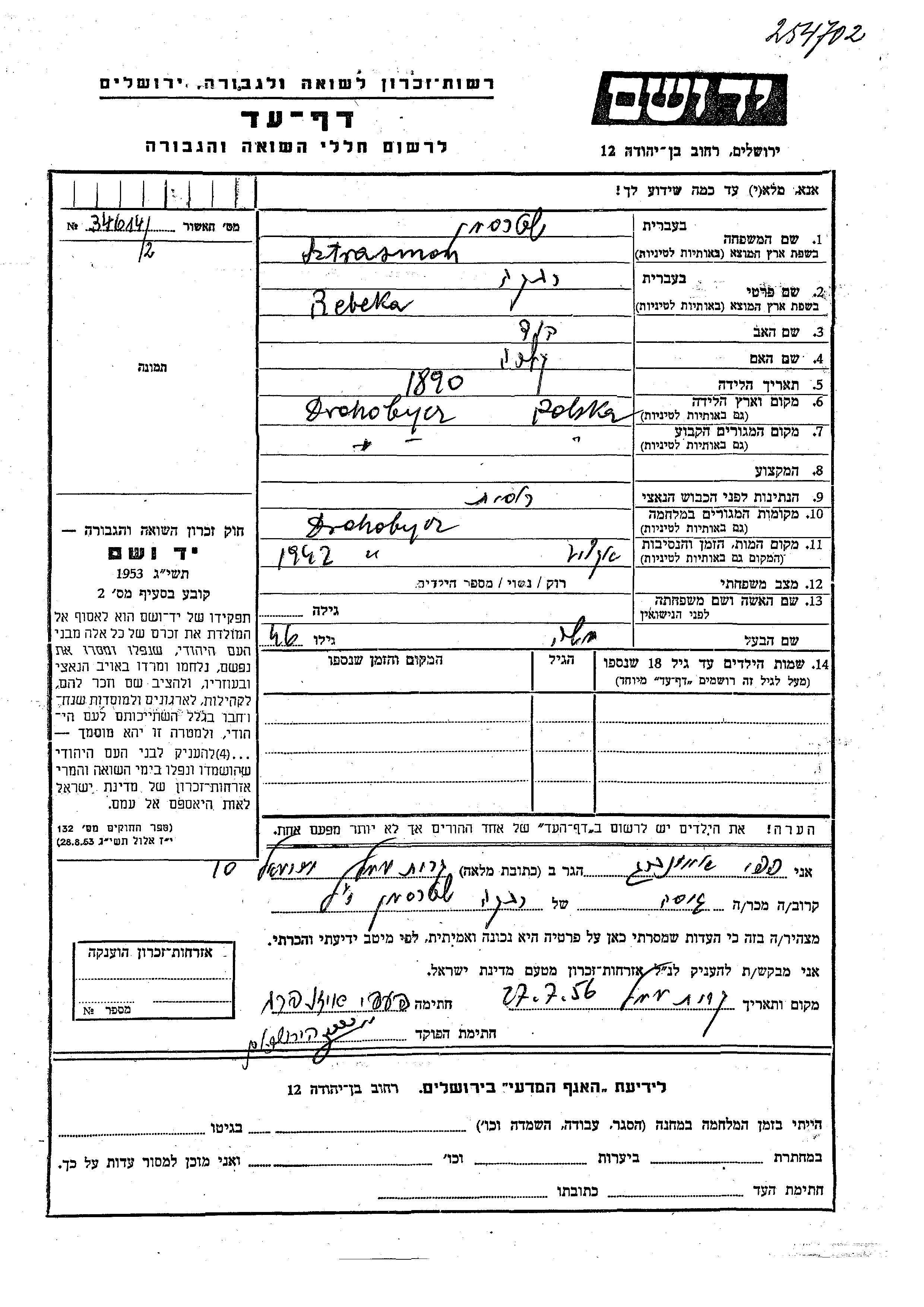 Rebeka Sztrasman was born in Drohobycz, Poland, 1890 to David and Klara. She was married to Moshe. Prior to WWII she lived in Drohobycz, Poland. During the war she was in Drohobycz, Poland. Rebeka was murdered in the Shoah. Place of death: Drohobycz, Poland, 1942.