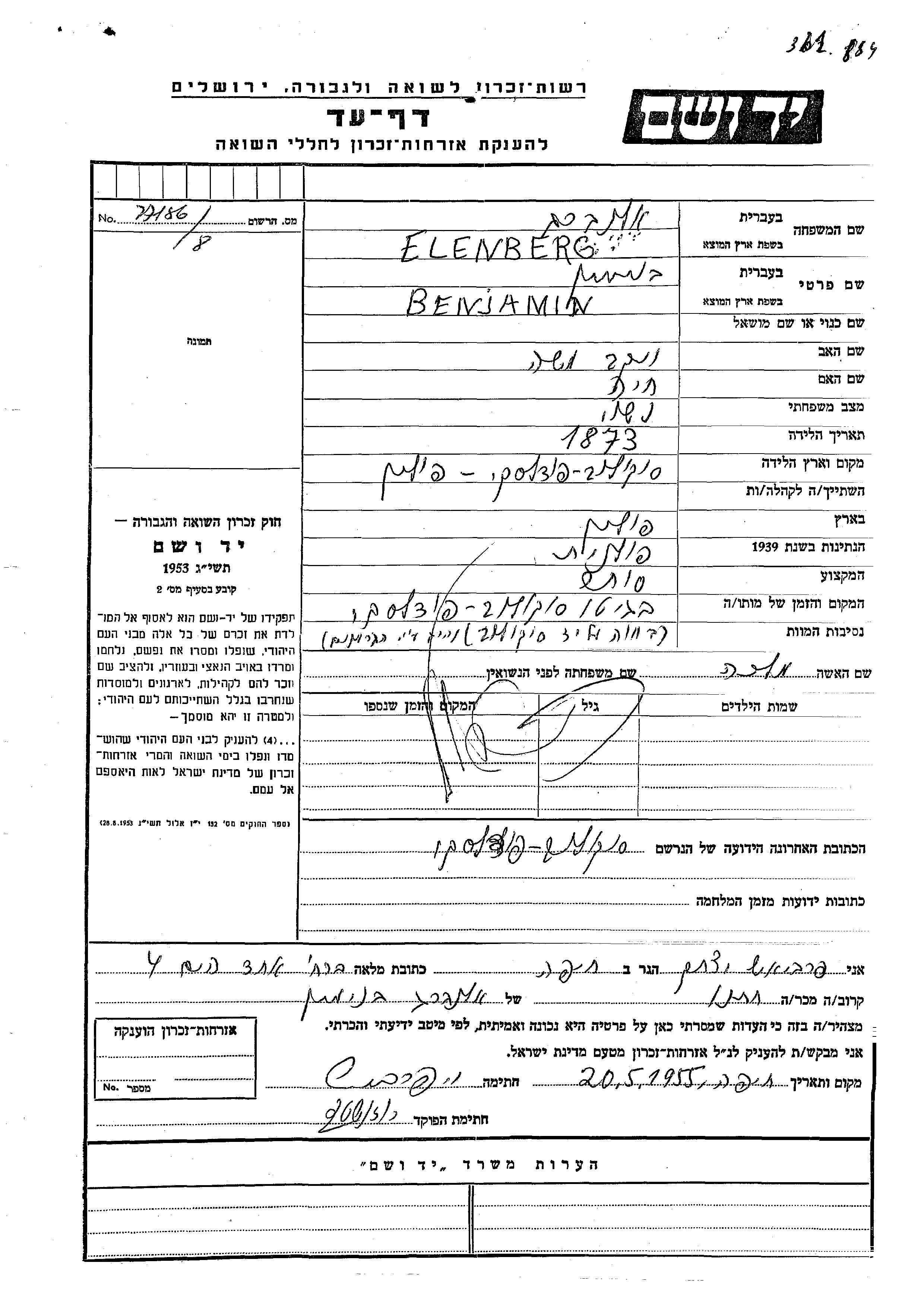 Elenberg Benjamin 1873 Sokolow Podlaski, Poland Page of Testimony