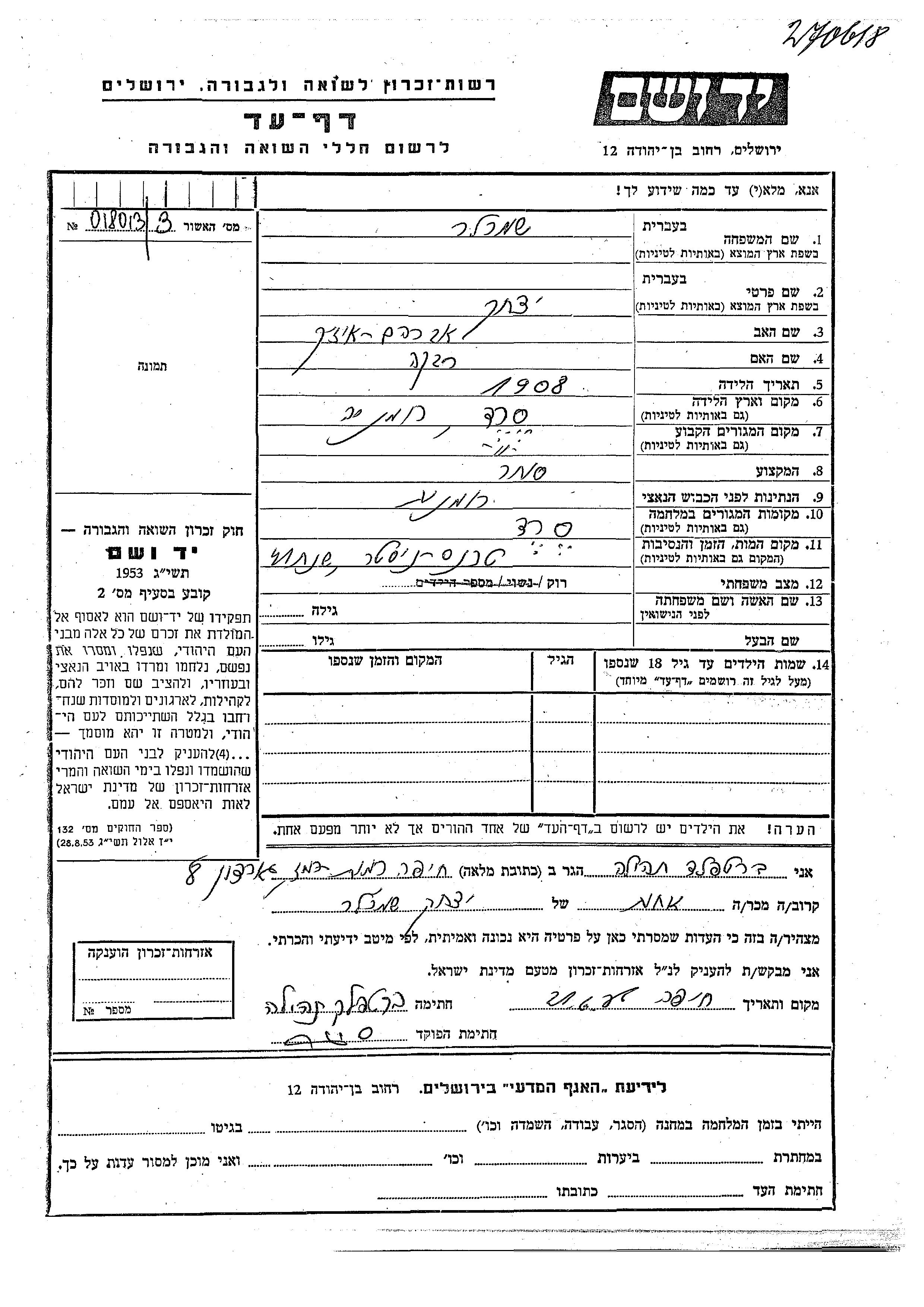 Shmarler Yitzkhak 1908 Siret, Romania Page of Testimony