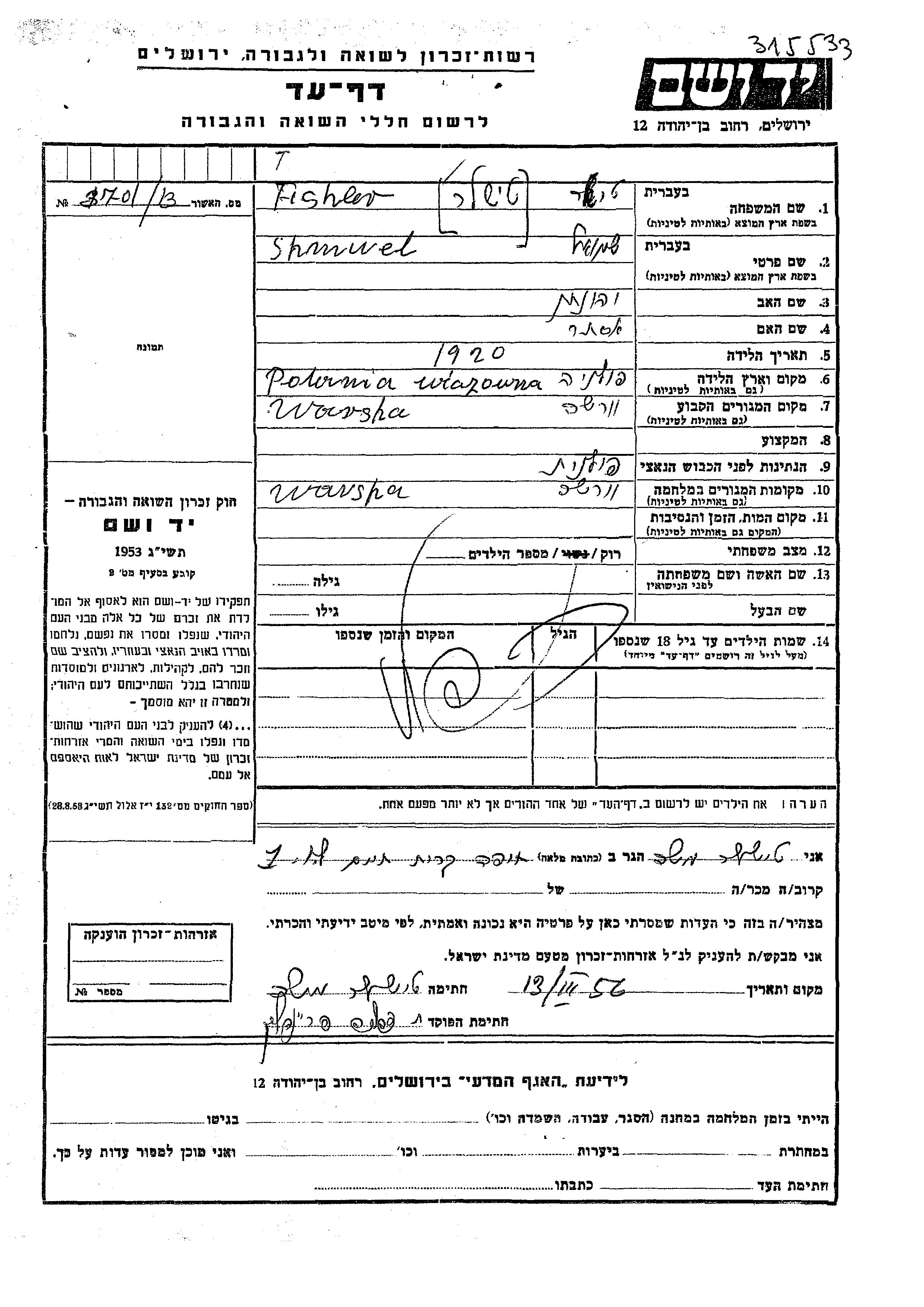 Shmuel Tishler was born in Wiazowna, Poland, 1920 to Jehonatan and Ester. He was single. Prior to WWII he lived in Warsaw, Poland. During the war he was in Warsaw, Poland. Shmuel was murdered in the Shoah.