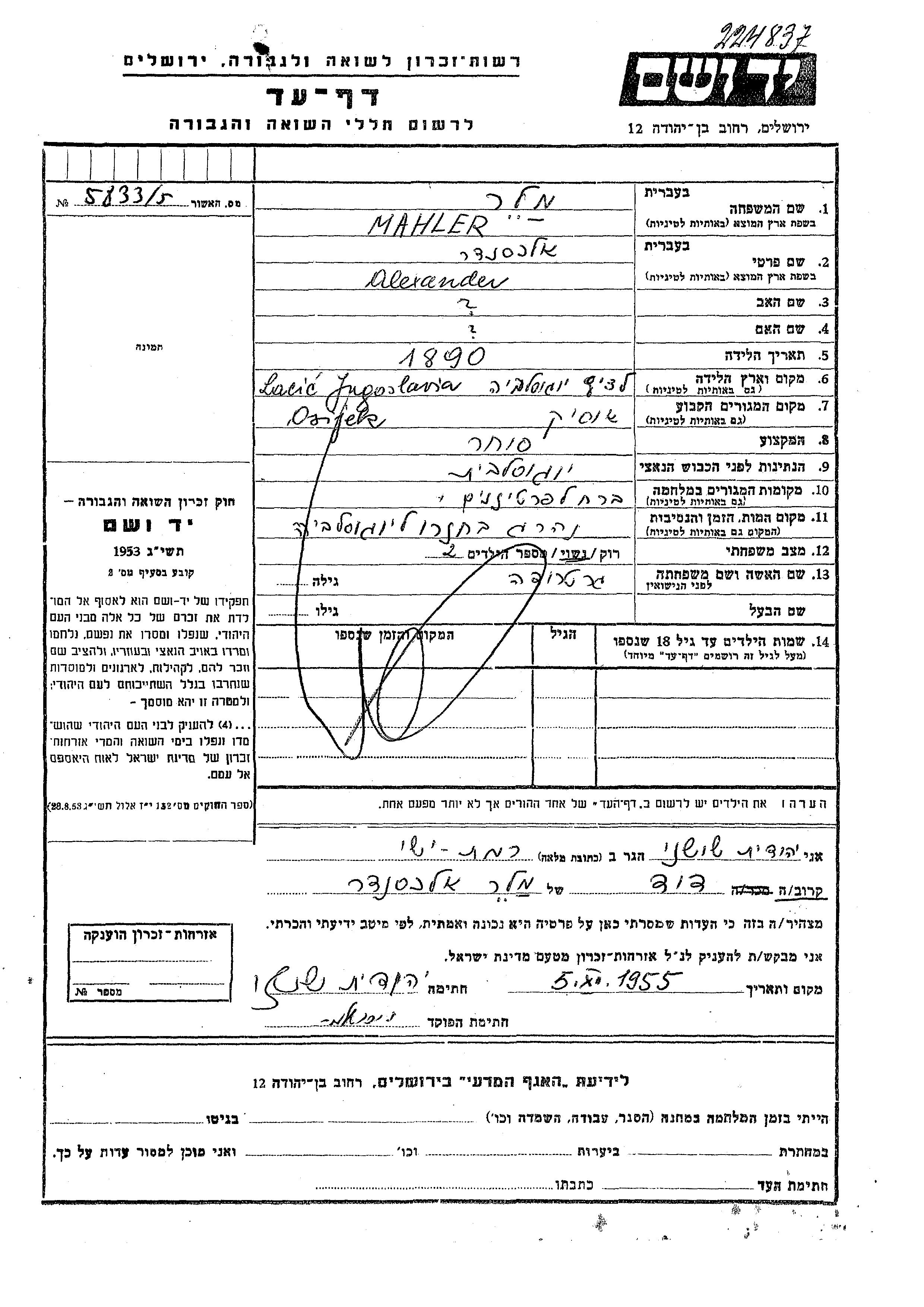 Mahler Alexander 1890 Osijek, Yugoslavia Page of Testimony