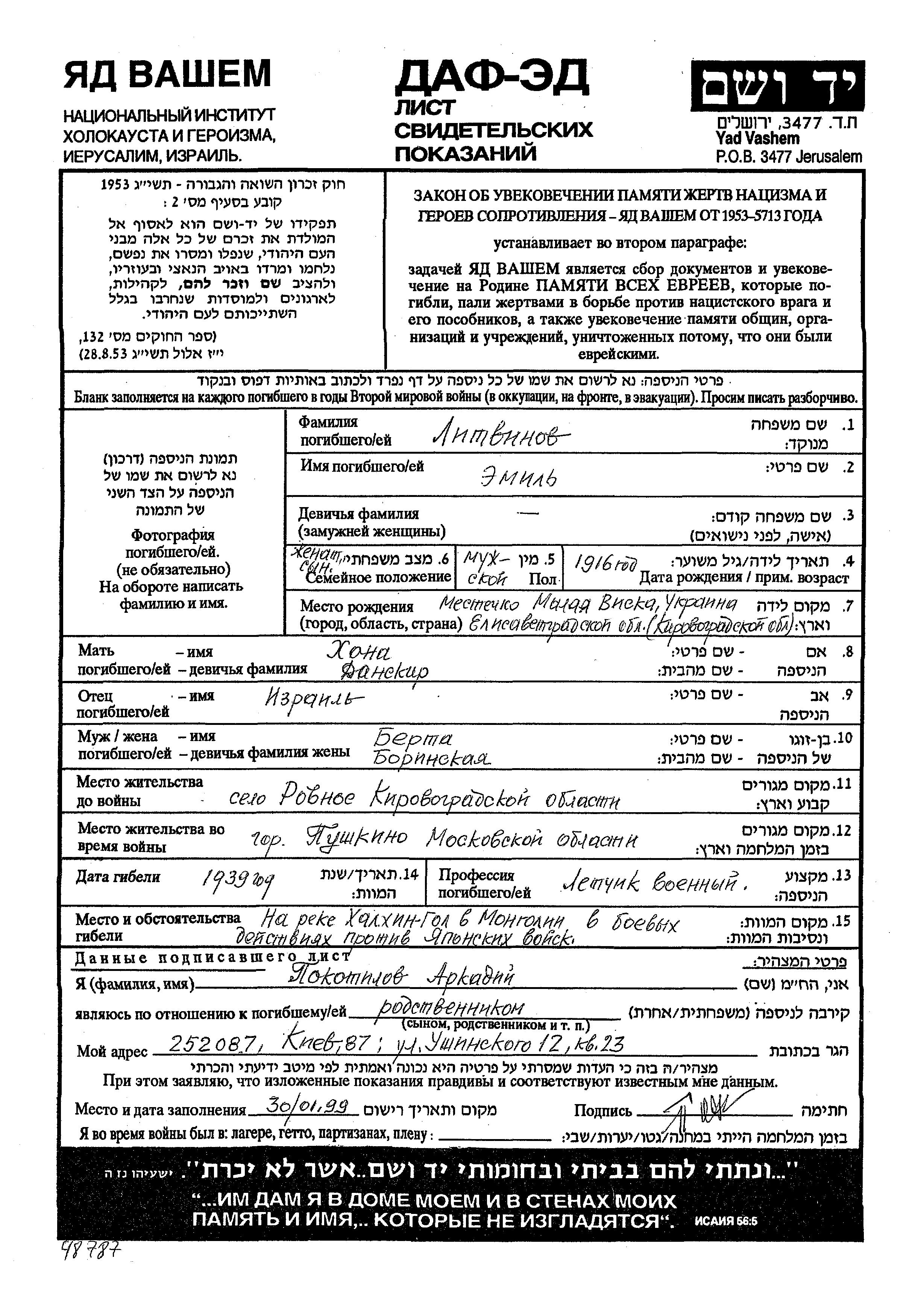Emil Litvinov was born in Malaya Viska, Ukraine (USSR), 1916 to Izrail and Khana nee Danskir. He was a voyenny lyotchik and married to Berta nee Borinskaya. Prior to WWII he lived in Rovnoye, Ukraine (USSR). During the war he was in Pushkino, Russia (USSR). Emil was killed in military service in WWII. Place of death: Khalkhin Gol, China, 1939.