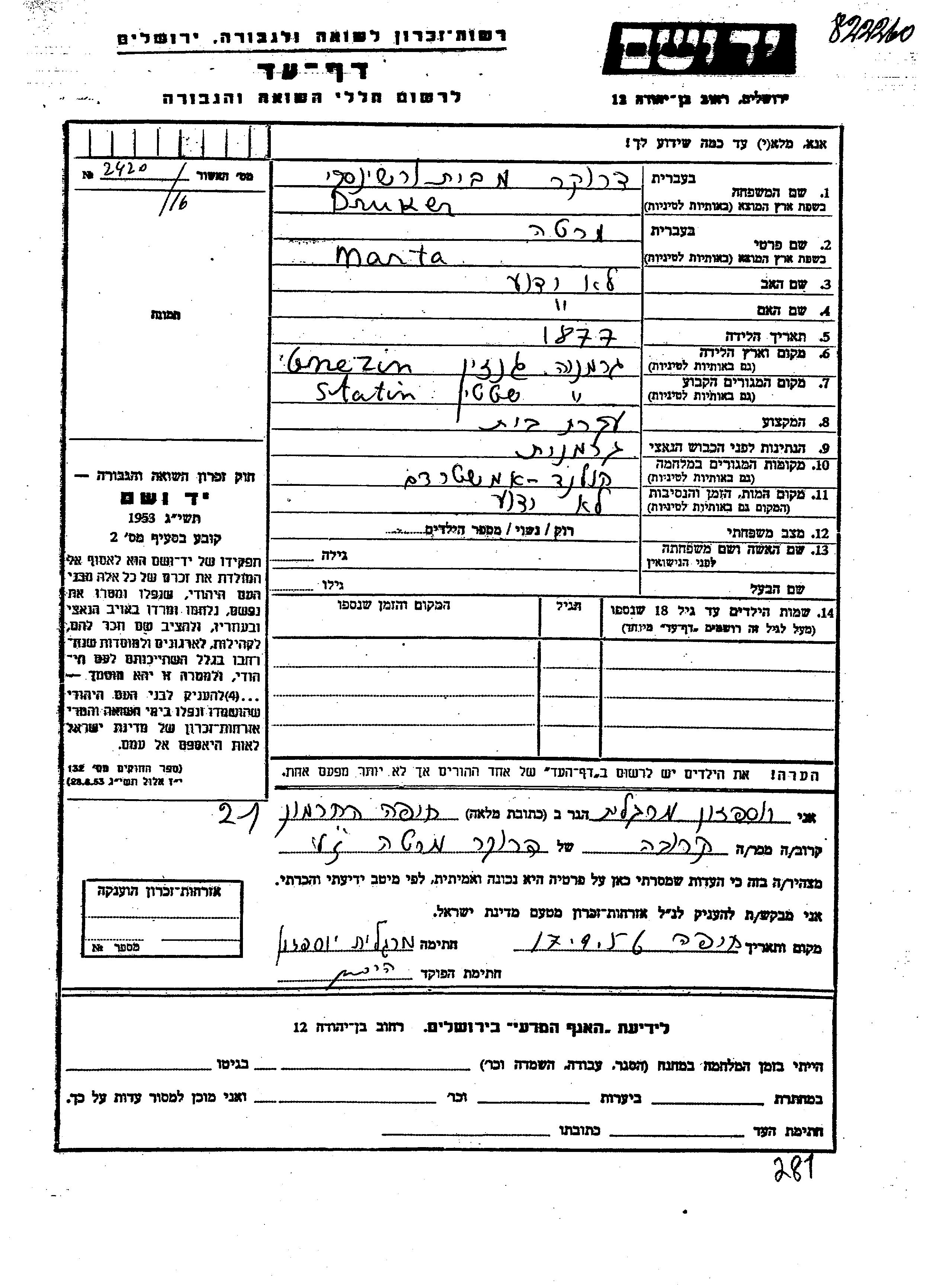 Marta Druker nee Vreshinski was born in Gniezno, Poland, 1877. She was a housewife. Prior to WWII she lived in Stettin, Germany. During the war she was in Amsterdam, The Netherlands. Marta was murdered in the Shoah.