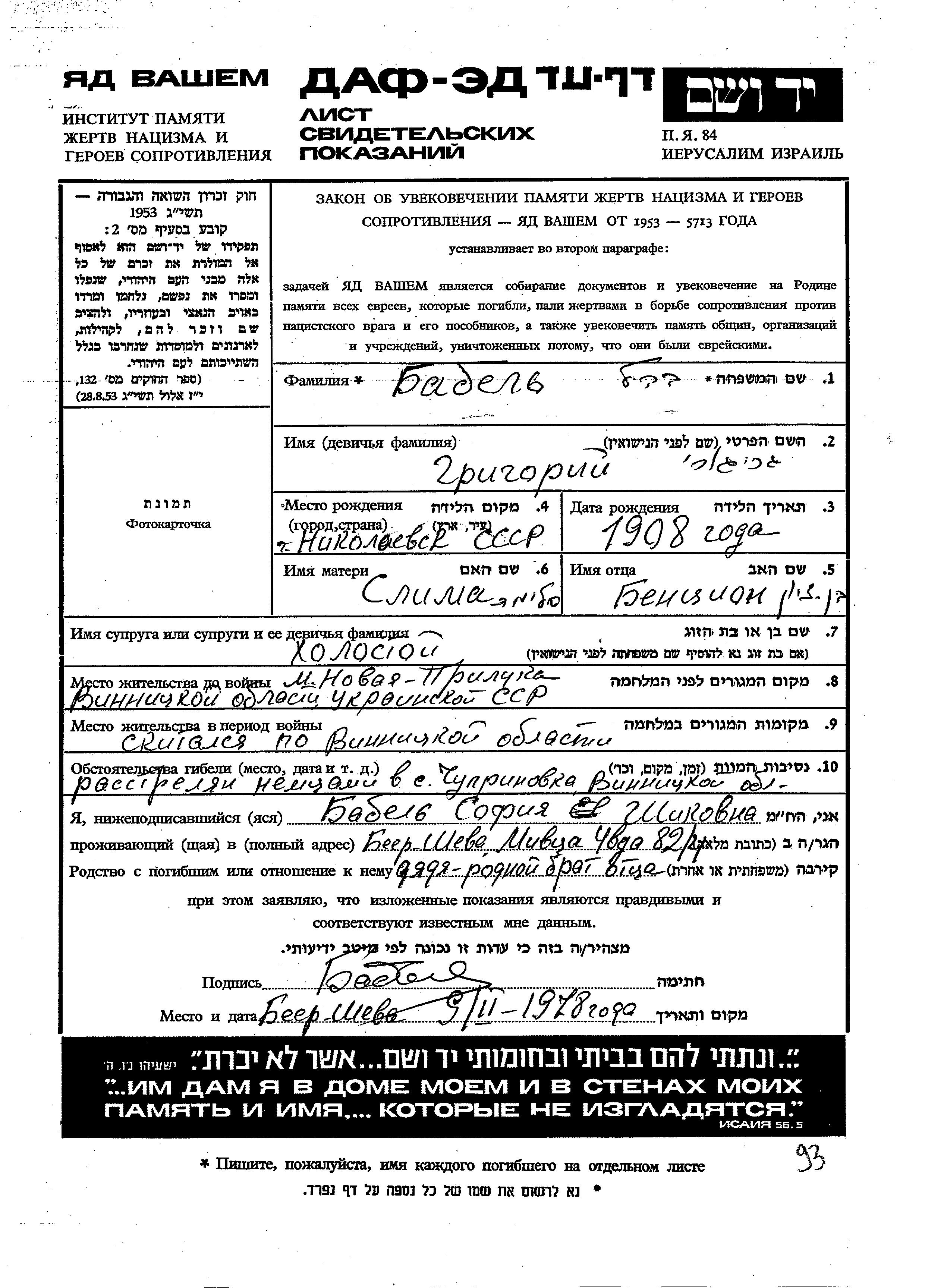 Grigori Babel was born in Nikolayevsk, Russia (USSR), 1908 to Bentzion and Slima. He was single. Prior to WWII he lived in Novaya Priluka, Ukraine (USSR). During the war he was in Vinnitsa, Ukraine (USSR). Grigori was murdered in the Shoah. Place of death: Chuprinovka, Ukraine (USSR).