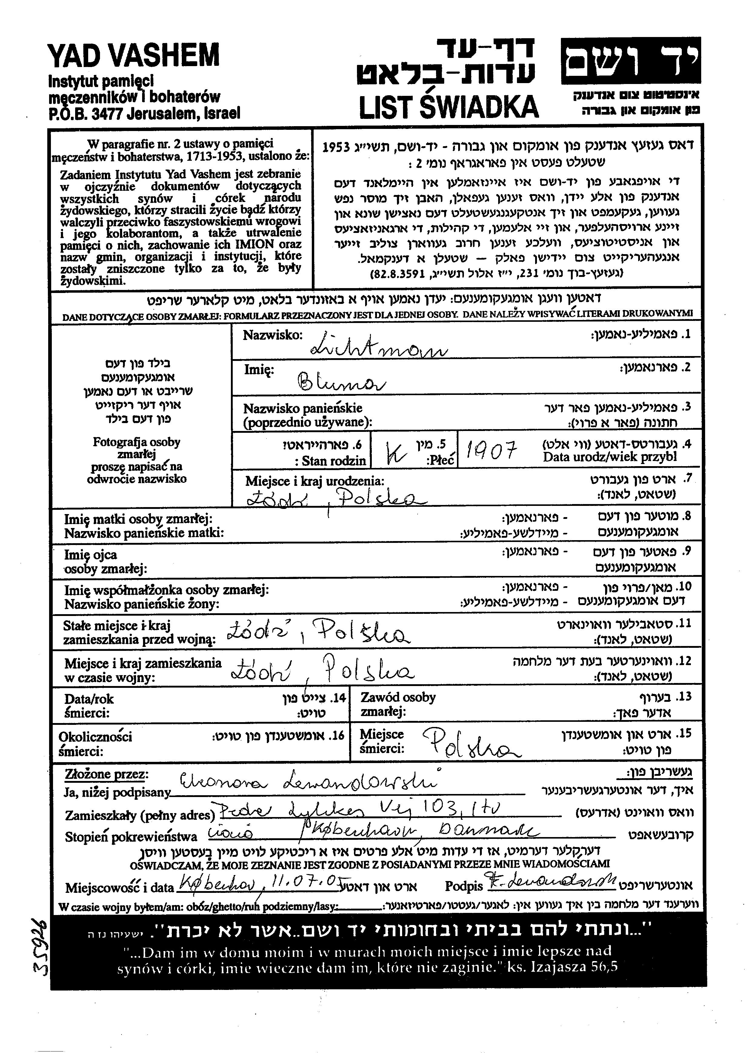 Lichtman Bluma 1907 Lodz, Poland Page of Testimony