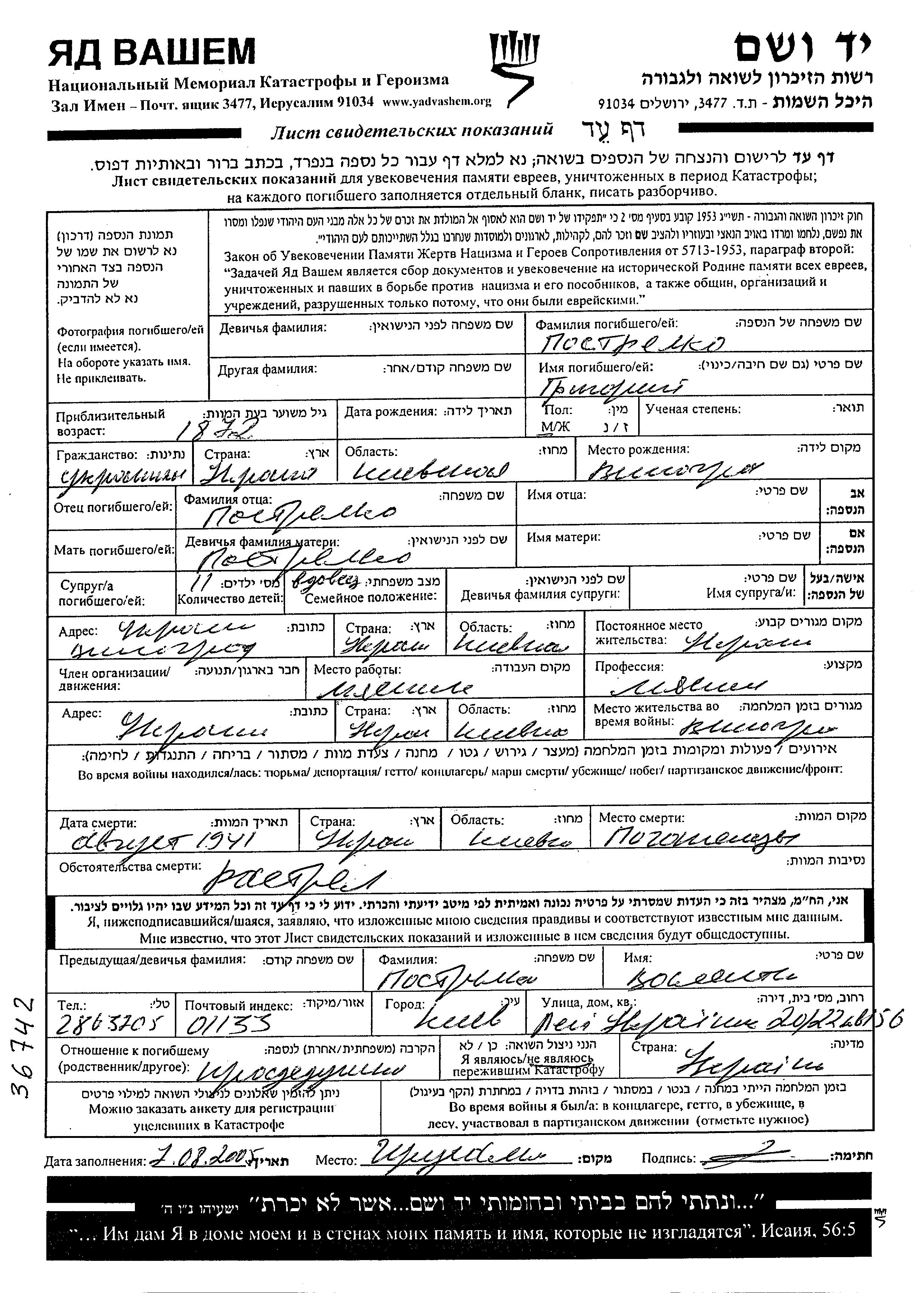 Grigori Postrelko was born in Vinograd, Ukraine (USSR), 1872. He was a butcher and a widower. Prior to WWII he lived in Vinograd, Ukraine (USSR). During the war he was in Vinograd, Ukraine (USSR). Grigori was murdered in the Shoah. Place of death: Pogoreltsy, Ukraine (USSR), 08/1941.