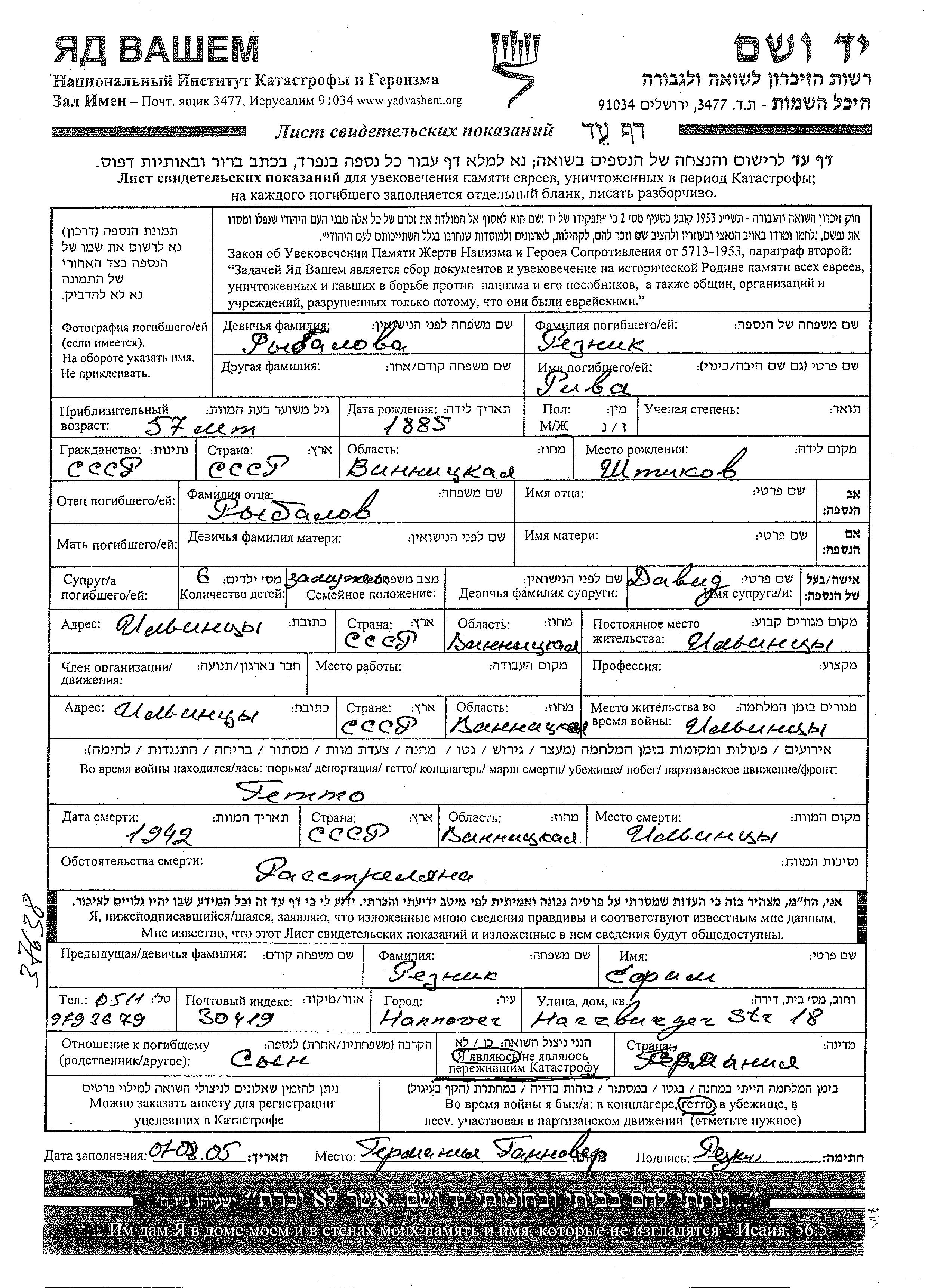 Riva Reznik nee Rybalova was born in Shpikov, Ukraine (USSR), 1885. She was married to David. Prior to WWII she lived in Ilyintsy, Ukraine (USSR). During the war she was in Ghetto. Riva was murdered in the Shoah. Place of death: Ilyintsy, Ukraine (USSR), 1942.