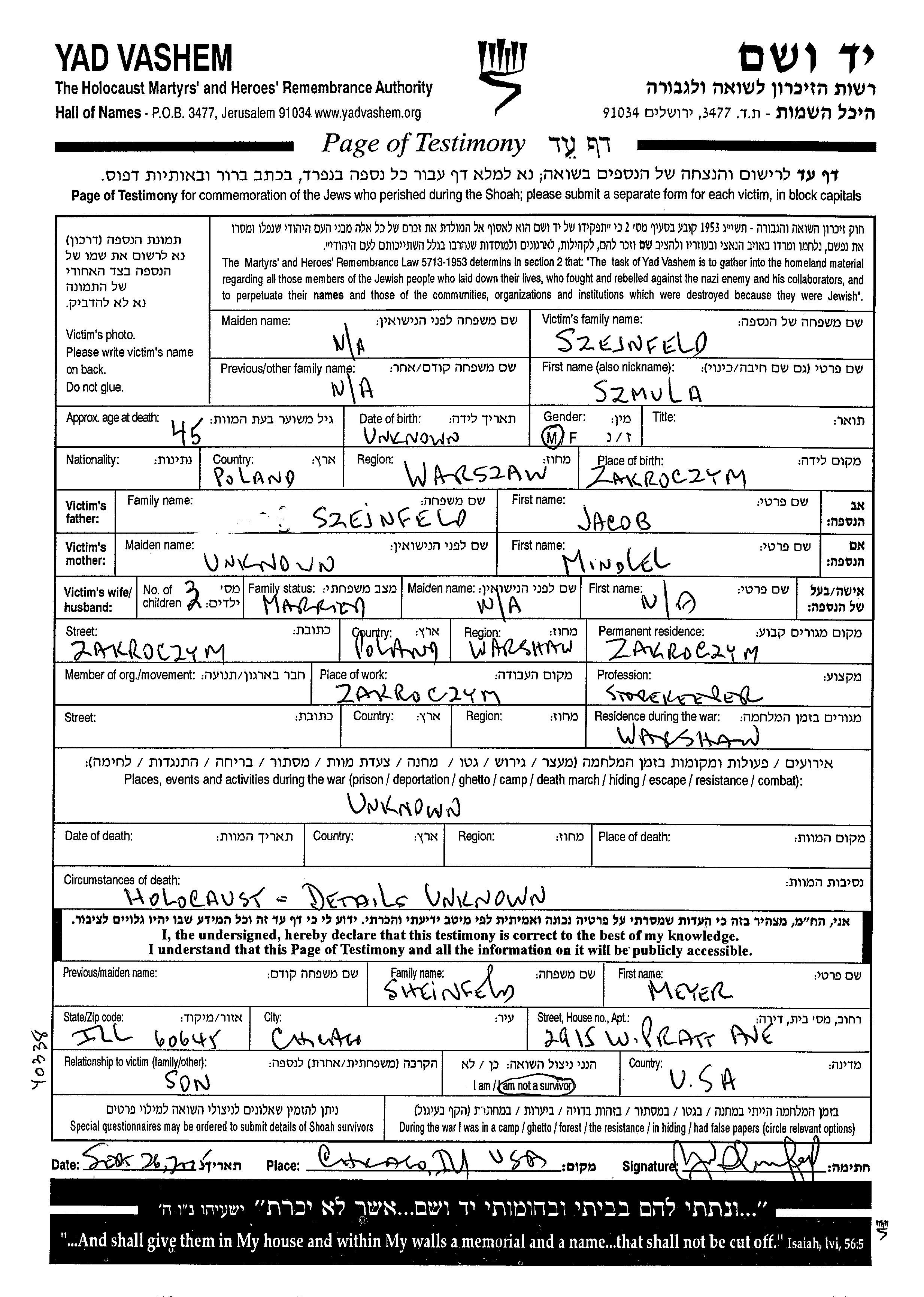Szmula Szejnfeld was born in Zakroczym, Poland to Jacob and Mindel. He was a storekeeper and married. Prior to WWII he lived in Zakroczym, Poland. During the war he was in Warsaw, Poland. Szmula was murdered in the Shoah.