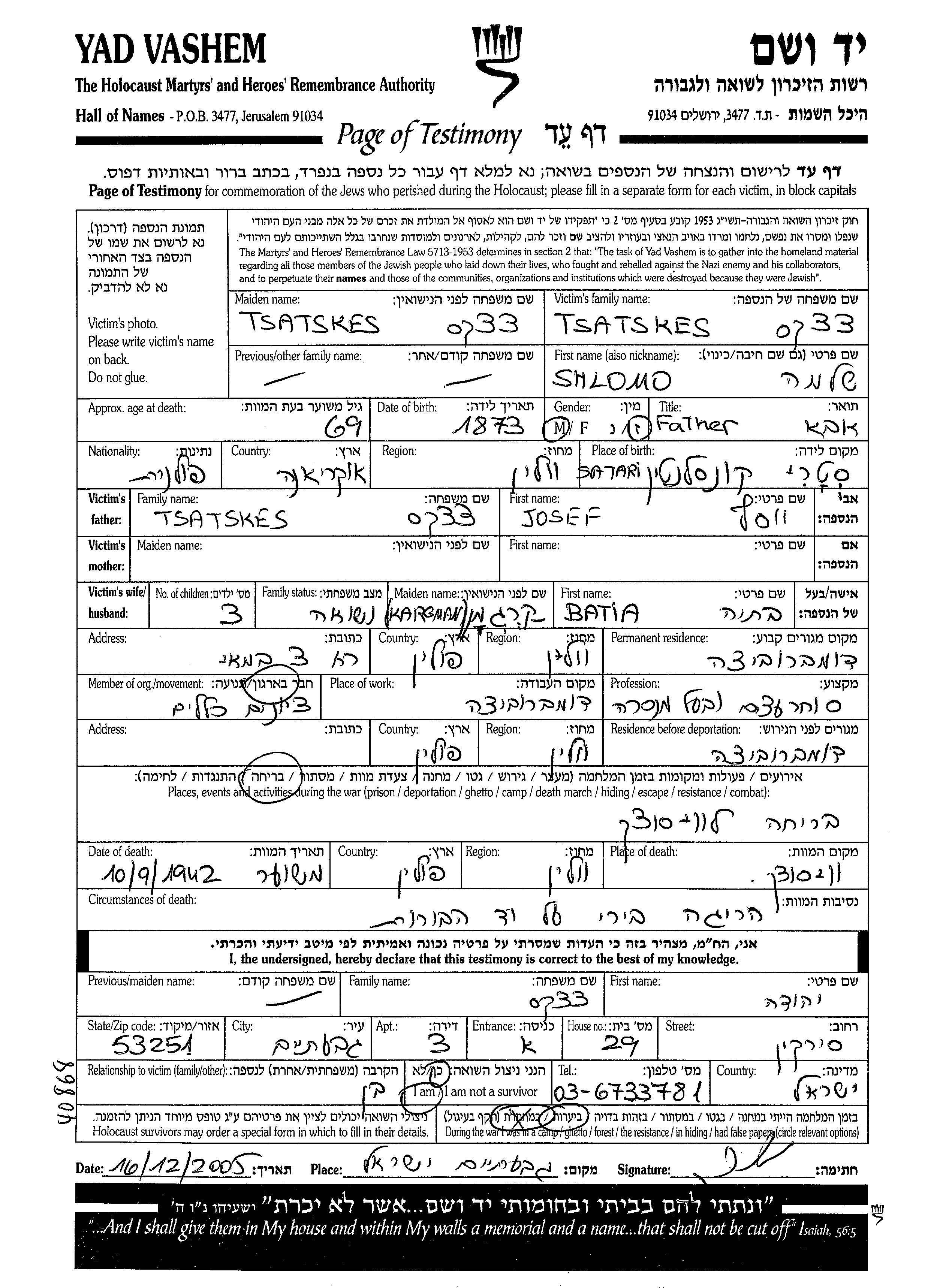 Shlomo Chachkes was born in Staro Konstantinov, Ukraine (USSR), 1873 to Yosef. He was a sawmill owner and married to Batia nee Kargman. Prior to WWII he lived in Dombrowica, Poland. During the war he was in Dombrowica, Poland. Shlomo was murdered in the Shoah. Place of death: Wysock, Poland, 10/09/1942.