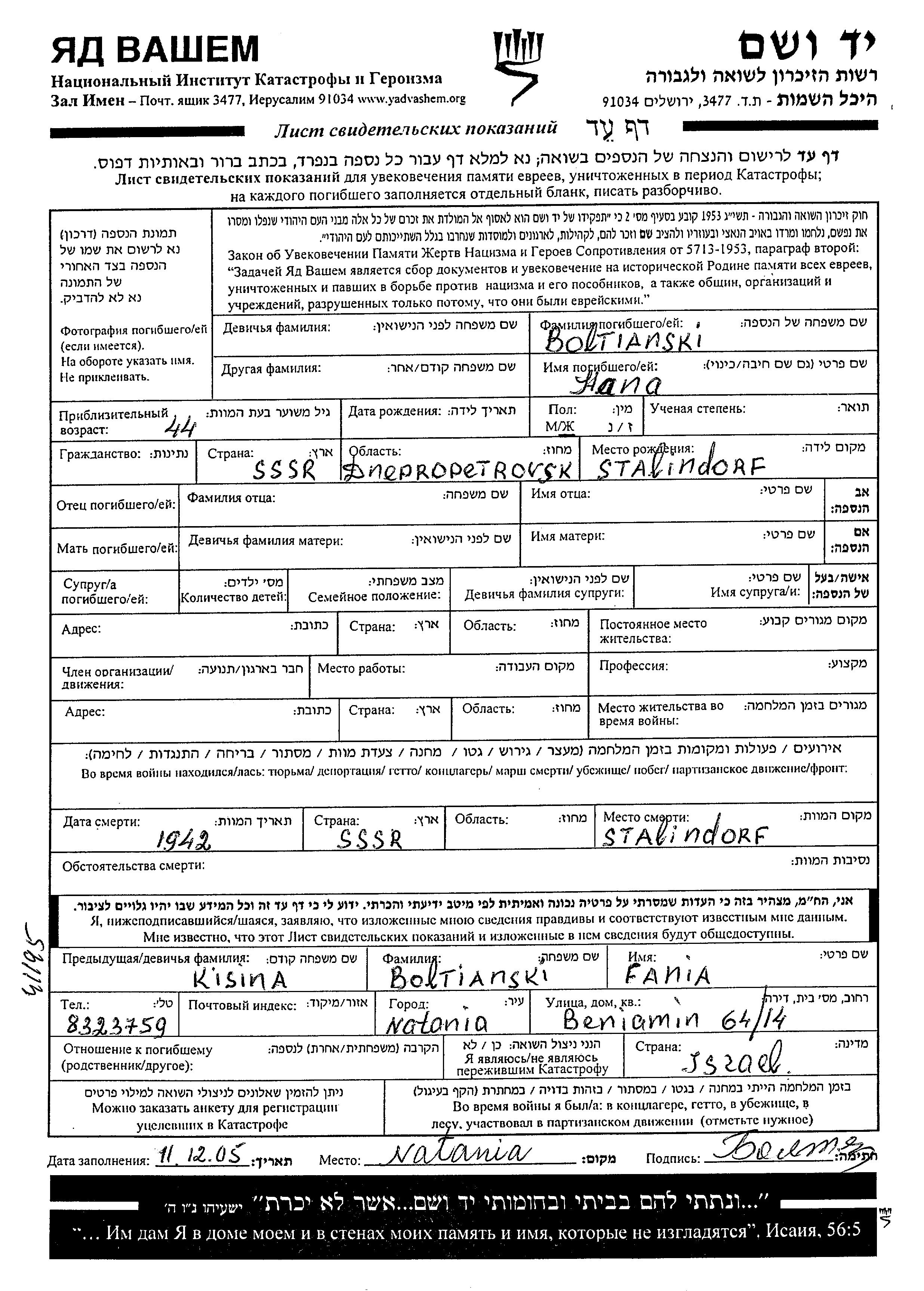 Boltianski Hana Stalindorf, Ukraine (USSR) Page of Testimony