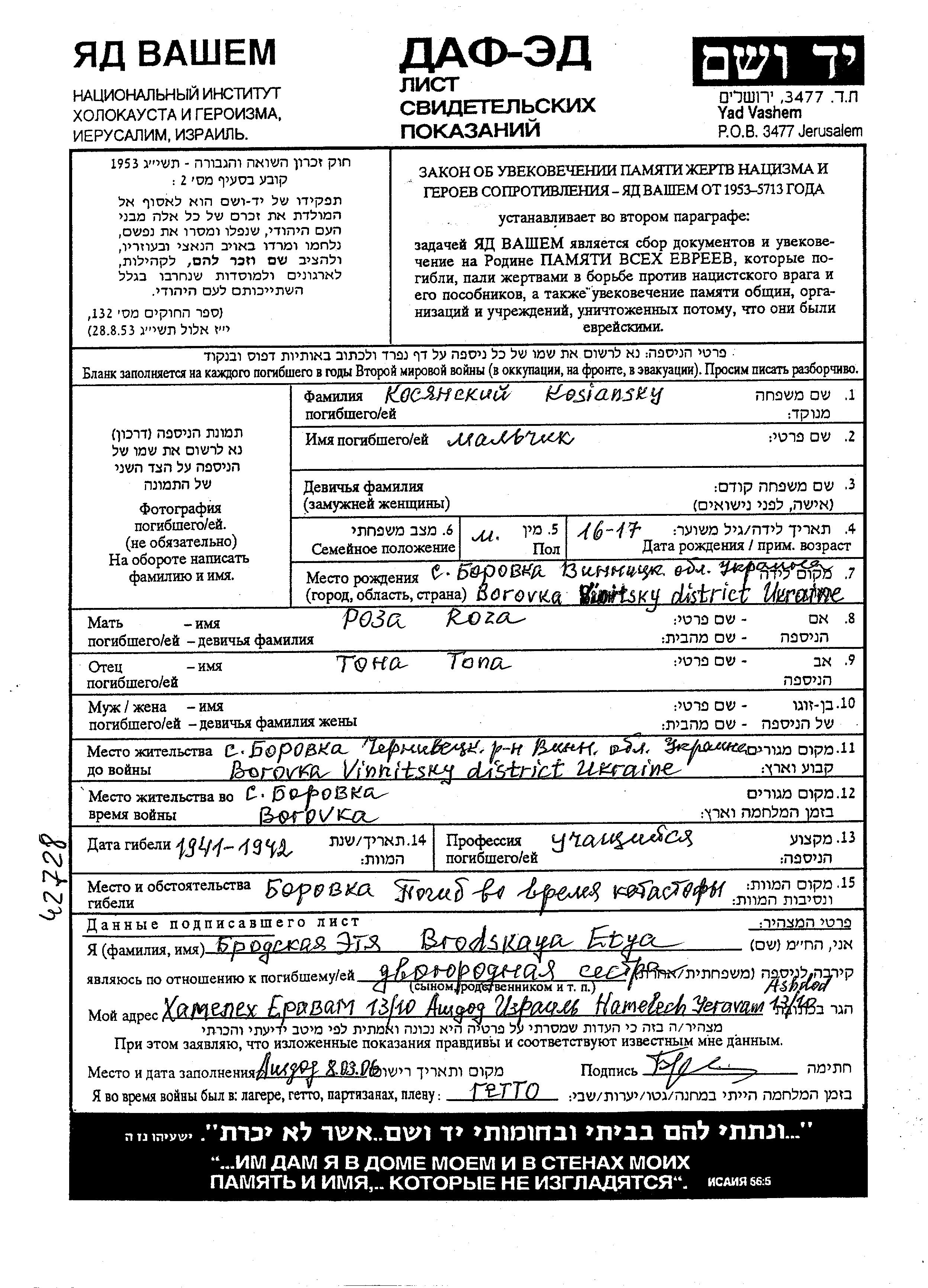 First name unknown Kosiansky was born in Borovka, Ukraine (USSR) to Tona and Roza. He was a pupil and teenager. Prior to WWII he lived in Borovka, Ukraine (USSR). During the war he was in Borovka, Ukraine (USSR). He was murdered in the Shoah. Place of death: Borovka, Ukraine (USSR), 1941.