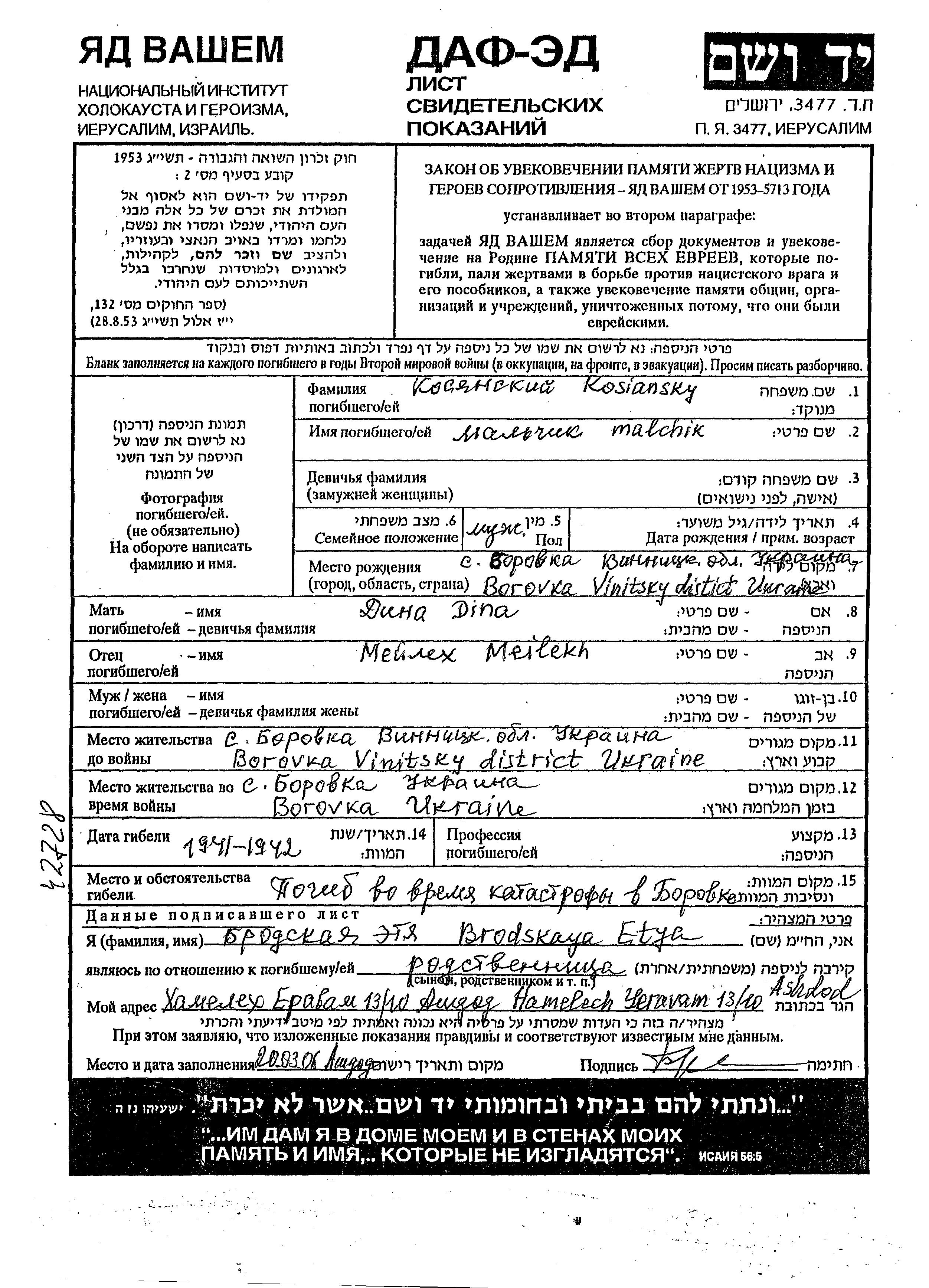 First name unknown Kosyanski was born in Borovka, Ukraine (USSR) to Meilekh and Dina. He was child. Prior to WWII he lived in Borovka, Ukraine (USSR). During the war he was in Borovka, Ukraine (USSR). He was murdered in the Shoah. Place of death: Borovka, Ukraine (USSR), 1941.