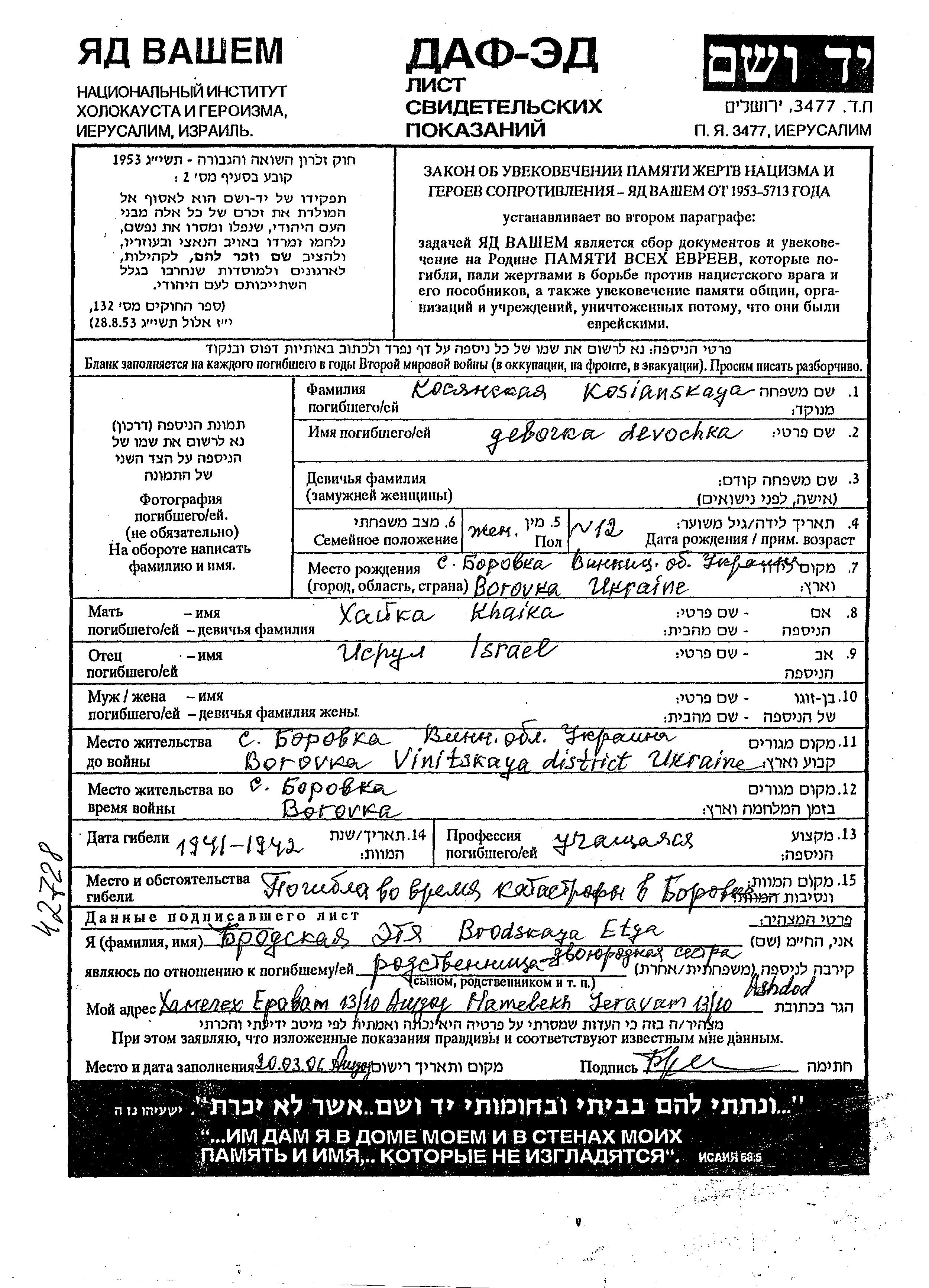 First name unknown Kosianskaya was born in Borovka, Ukraine (USSR) to Israel and Khaika. She was a pupil and child. Prior to WWII she lived in Borovka, Ukraine (USSR). During the war she was in Borovka, Ukraine (USSR). She was murdered in the Shoah. Place of death: Borovka, Ukraine (USSR), 1941.