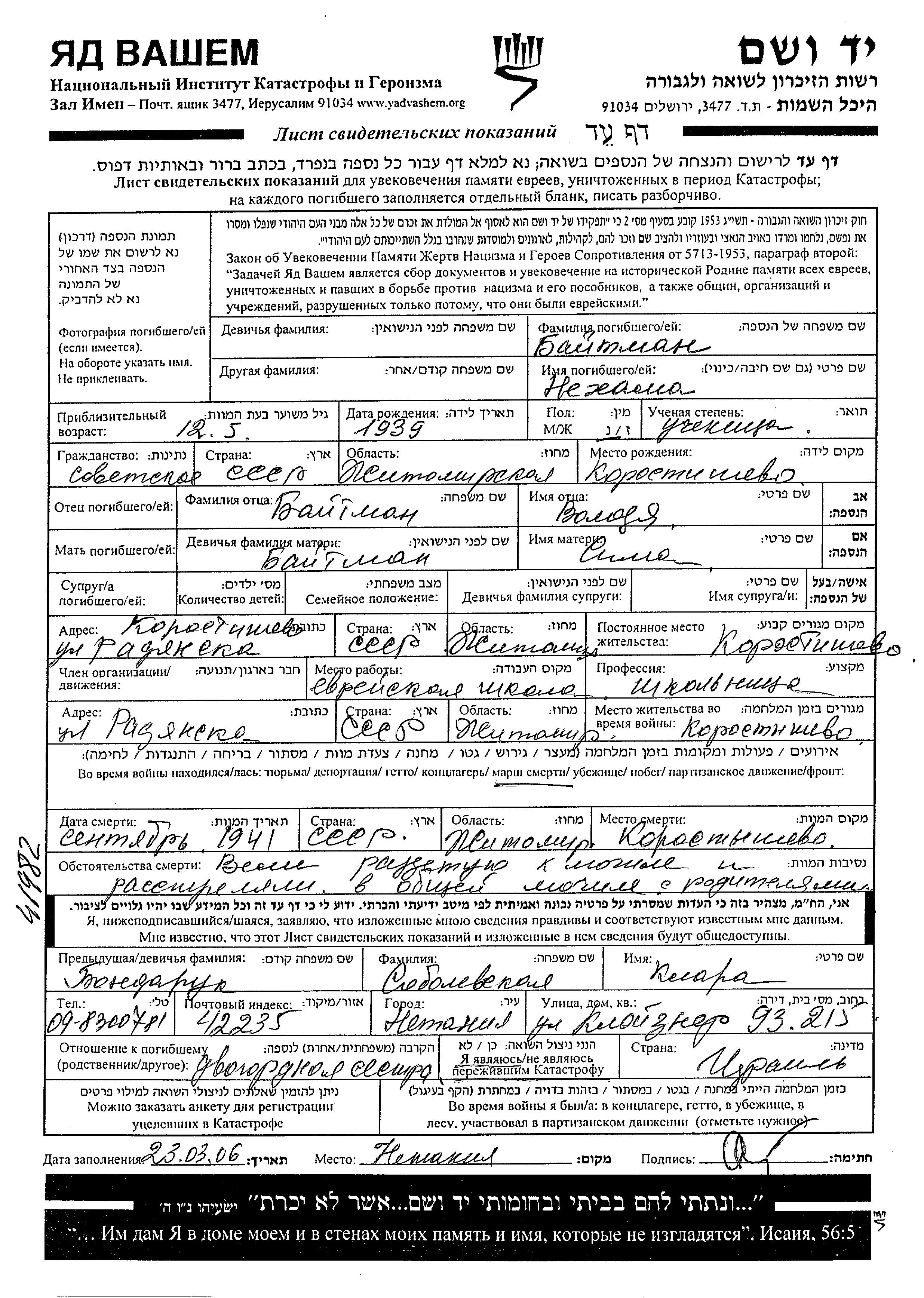 Nekhama Baitman was born in Korostyshev, Ukraine (USSR), 1939 to Volodya and Sima. She was child. Prior to WWII she lived in Korostyshev, Ukraine (USSR). During the war she was in Korostyshev, Ukraine (USSR). Nekhama was murdered in the Shoah. Place of death: Korostyshev, Ukraine (USSR), 09/1941.