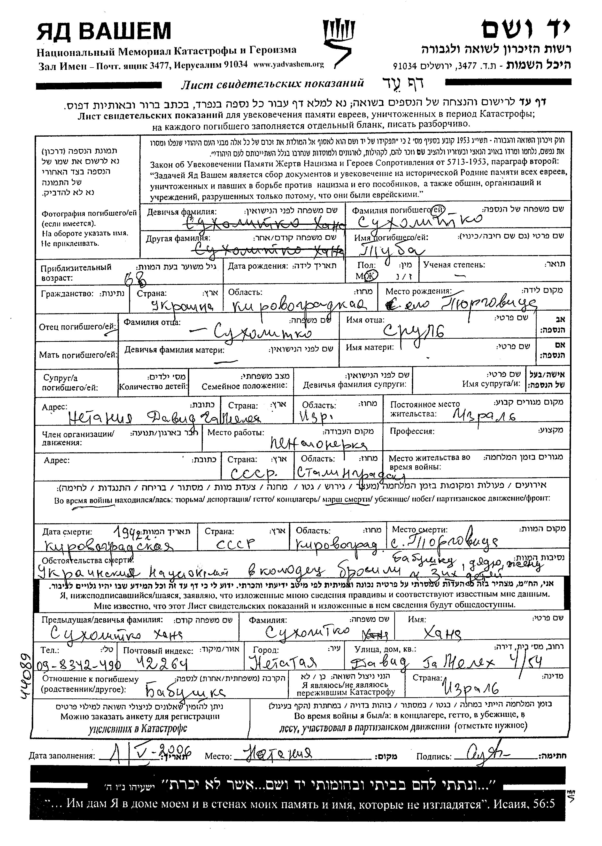 Tuba Sukholitko was born in Torgovitsa, Ukraine (USSR) to Srul. She was a pensioner and married. Prior to WWII she lived in Torgovitsa, Ukraine (USSR). During the war she was in Torgovitsa, Ukraine (USSR). Tuba was murdered in the Shoah. Place of death: Torgovitsa, Ukraine (USSR), 1942.