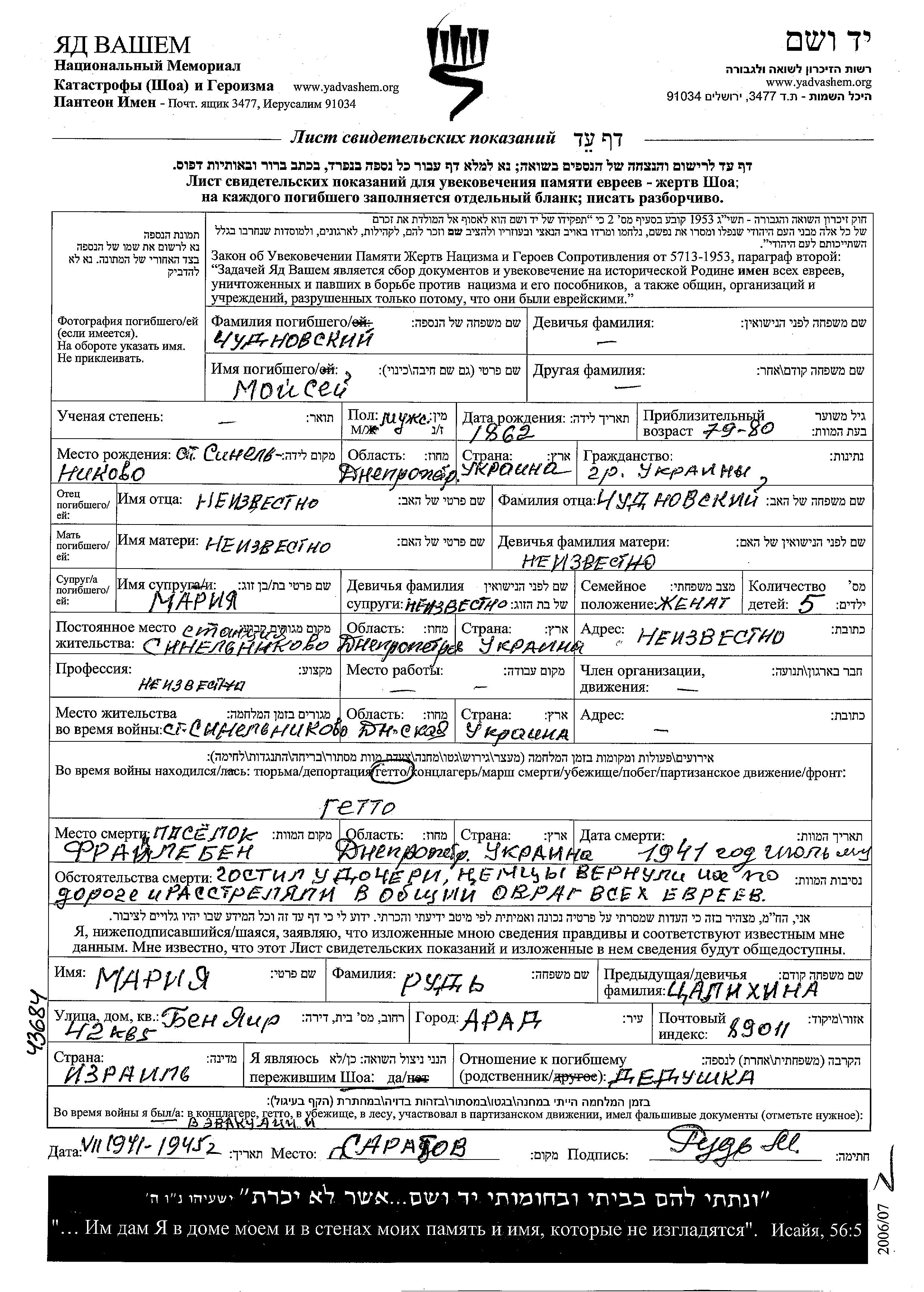 Chudnovski Moisei 1862 Sinelnikovo, Ukraine (USSR) Page of Testimony