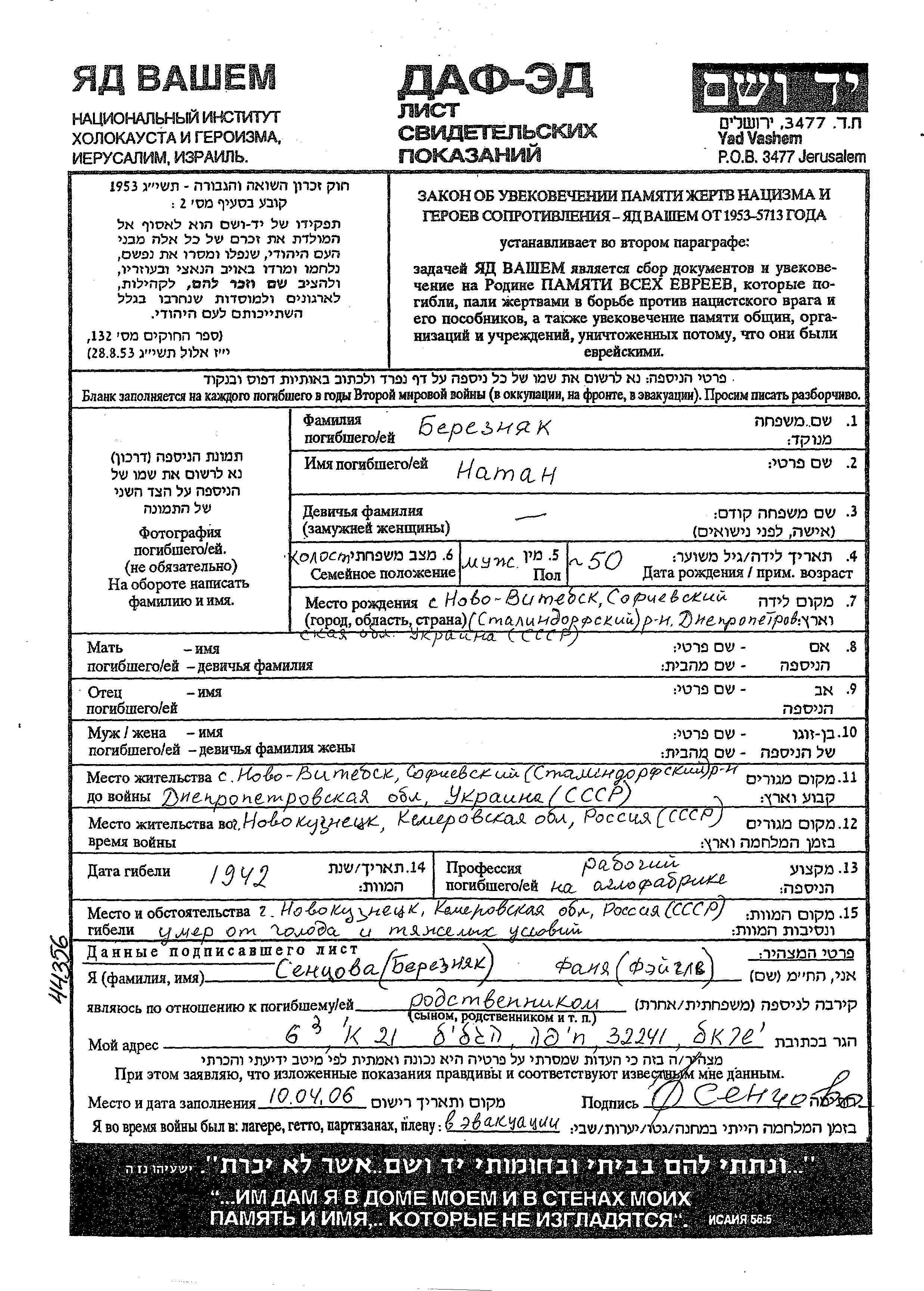 Bereznyak Natan Novo Vitebsk, Ukraine (USSR) Page of Testimony