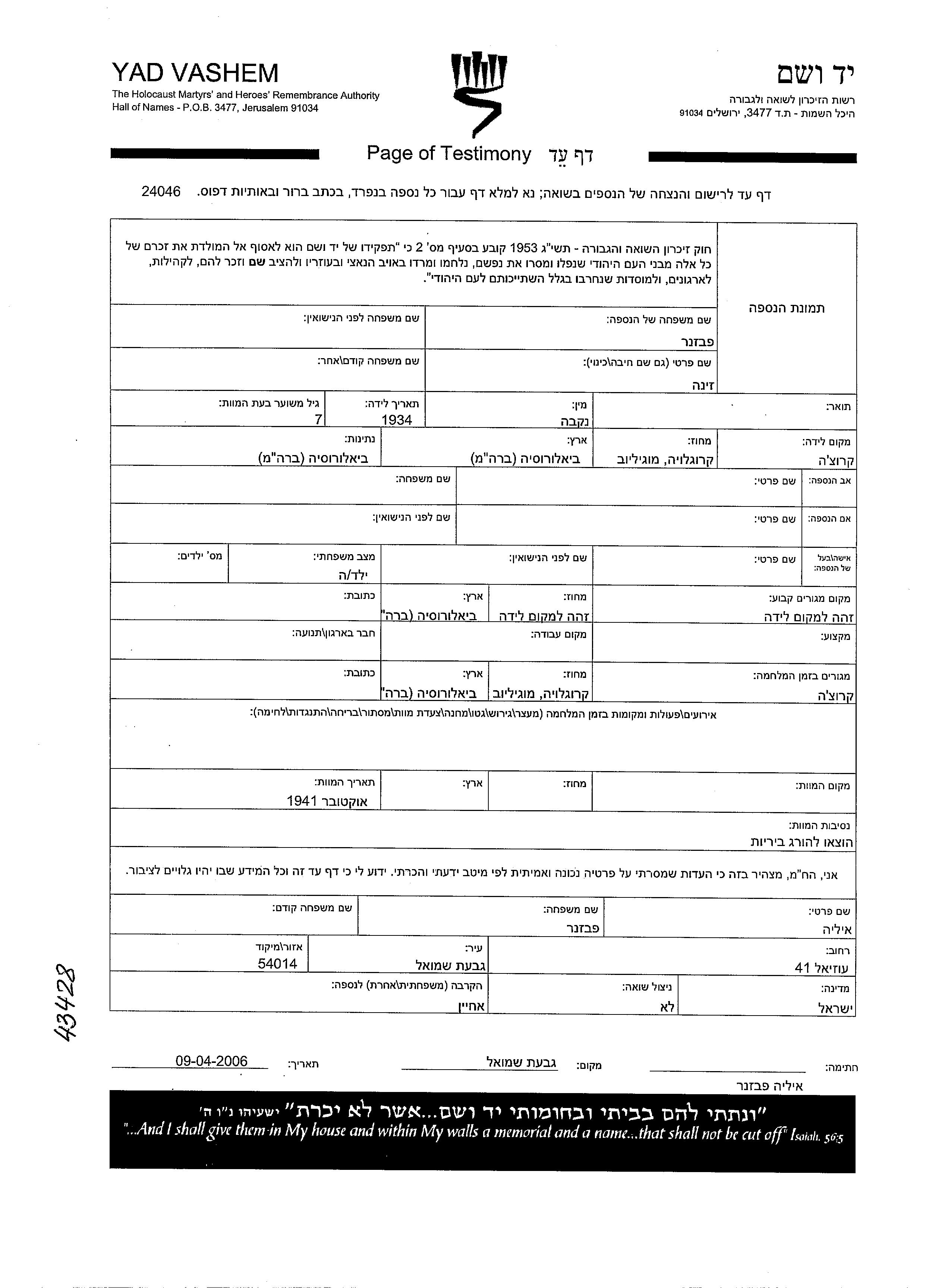 Zina Pevzner was born in Krucha, Belorussia (USSR), 1934. She was child. Prior to WWII she lived in Krucha, Belorussia (USSR). During the war she was in Krucha, Belorussia (USSR). Zina was murdered in the Shoah. Place of death: Krucha, Belorussia (USSR), 10/1941.