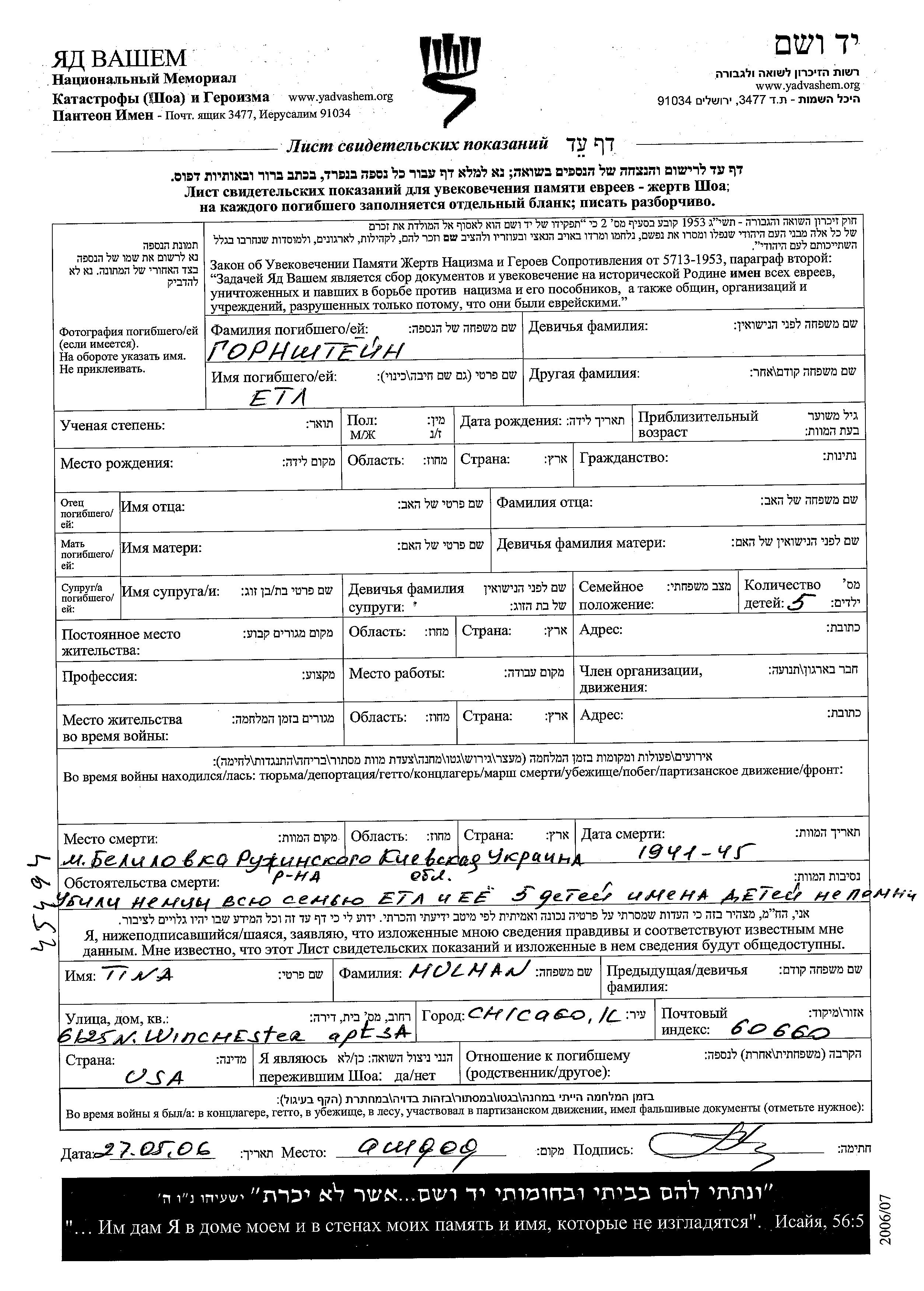 Gornshtein Etl Belilovka, Ukraine (USSR) Page of Testimony