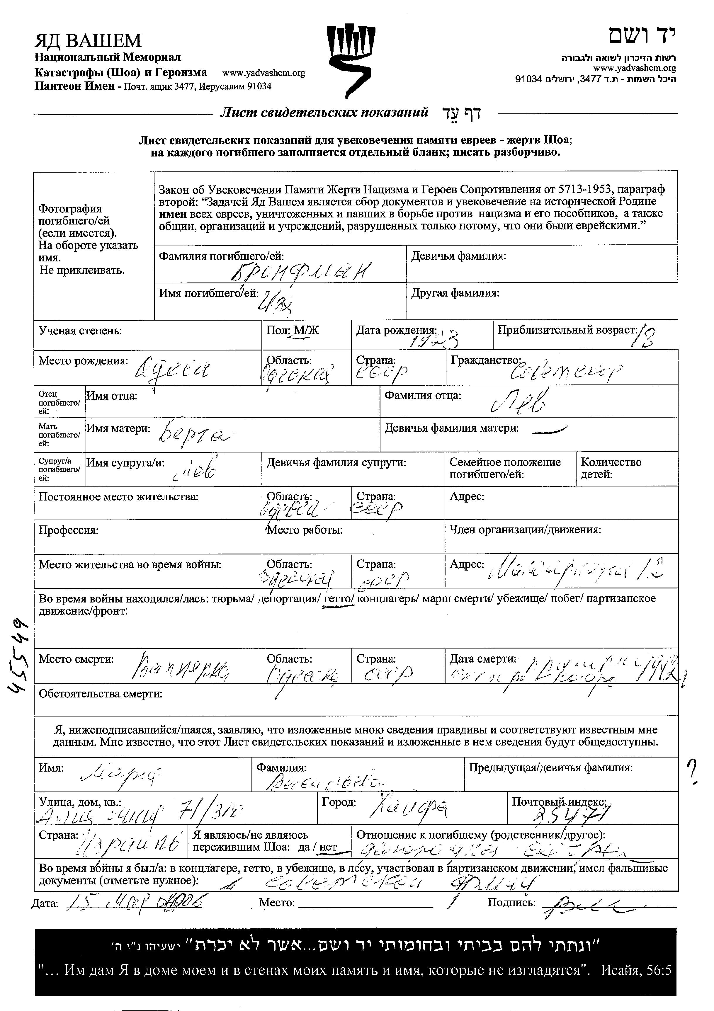 Izya Bronfman was born in Odessa, Ukraine (USSR) to Lev and Berta. He was married to Lev. Prior to WWII he lived in Odessa, Ukraine (USSR). During the war he was in Odessa, Ukraine (USSR). Izya was murdered in the Shoah. Place of death: Vapnyarka, Ukraine (USSR), 09/1942.