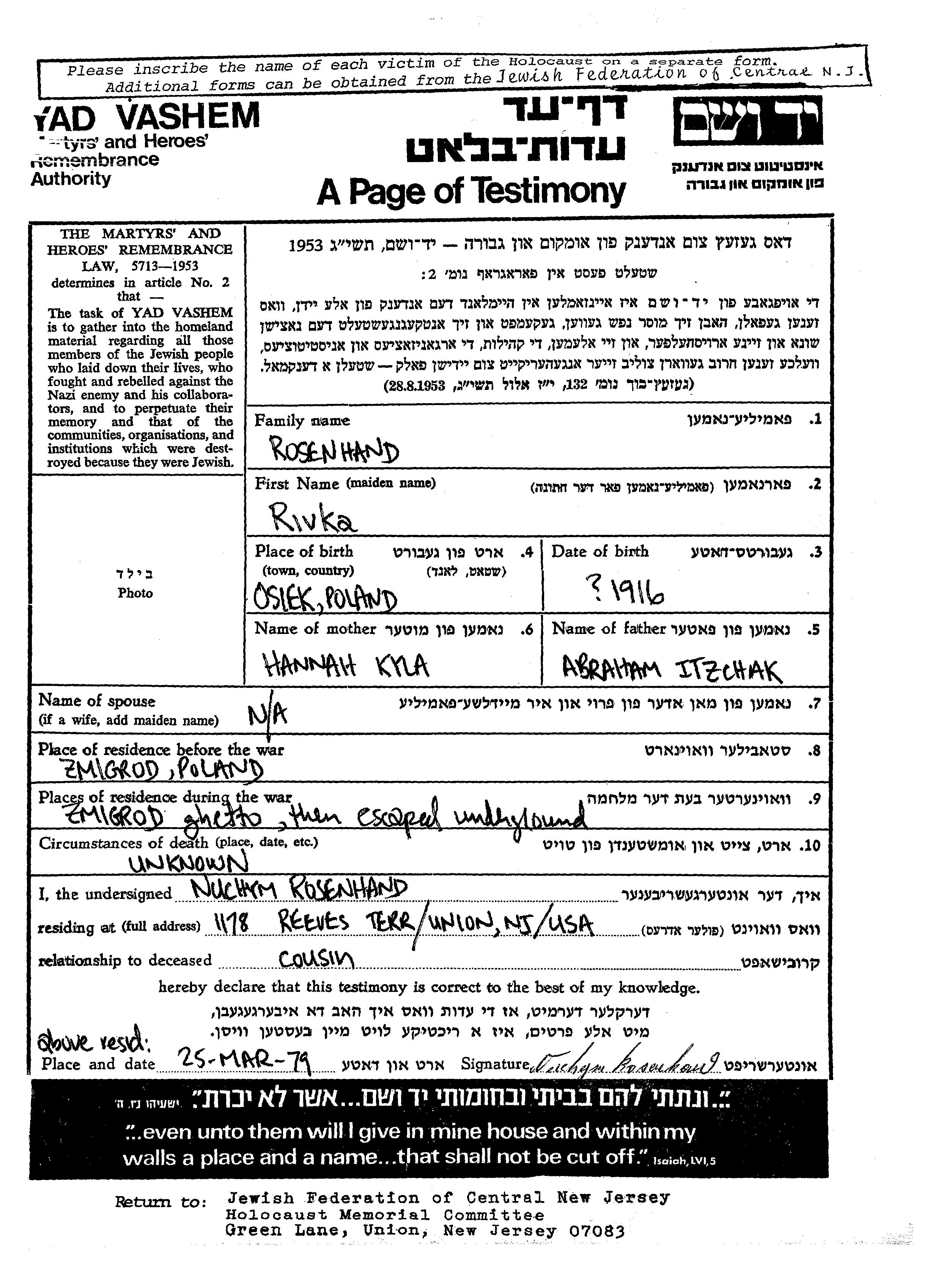 Rivka Rosenhand was born in Osiek, Poland, 1916 to Abraham Itzchak and Hannah Kyla. Prior to WWII she lived in Zmigrod, Poland. During the war she was in Zmigrod, Poland. Rivka was murdered in the Shoah.