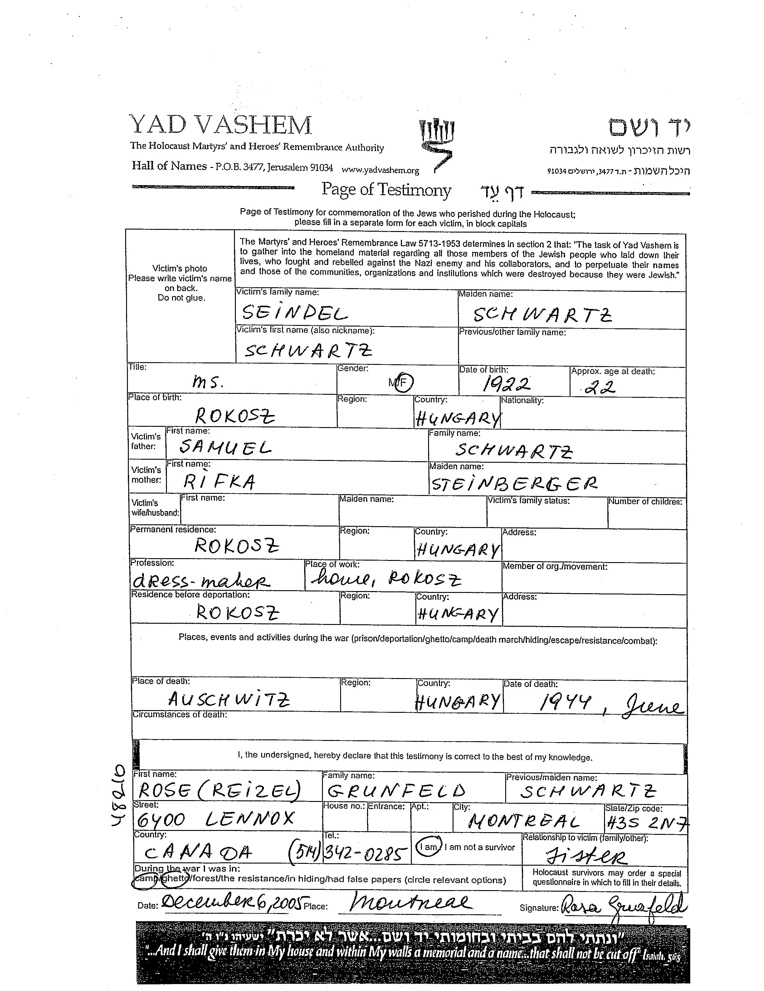 Seindel Schwartz was born in Rakos, Hungary, 1922 to Samuel and Rifka nee Steinberger. She was a dressmaker. Prior to WWII she lived in Rakos, Hungary. During the war she was in Rakos, Hungary. Seindel was murdered in the Shoah. Place of death: Auschwitz, Poland, 06/1944.
