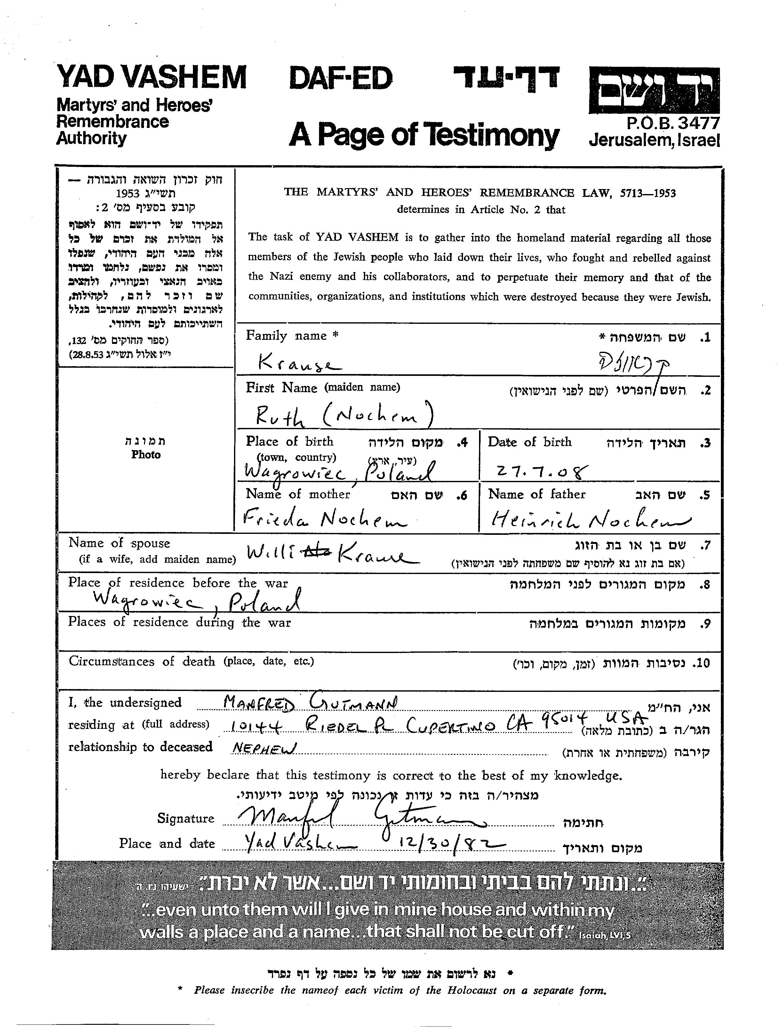 Ruth Krause nee Nochem was born in Wagrowiec, Poland, 1908 to Heinrich and Frieda. She was married to Willi. Prior to WWII she lived in Wagrowiec, Poland. Ruth was murdered in the Shoah.