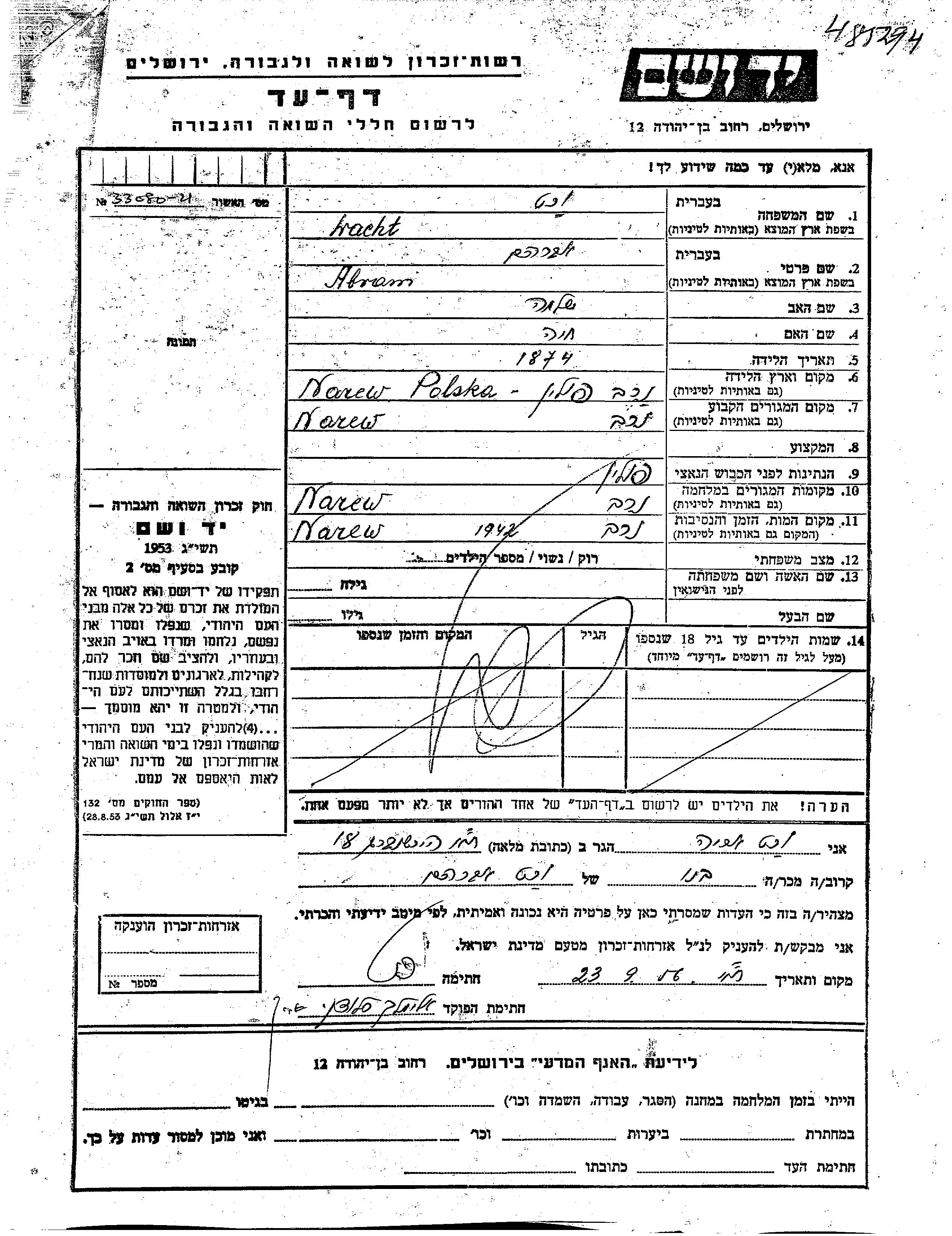Abram Wacht was born in Narew, Poland, 1874 to Shlomo and Khaia. He was married. Prior to WWII he lived in Narew, Poland. During the war he was in Narew, Poland. Abram was murdered in the Shoah. Place of death: Narew, Poland, 1942.