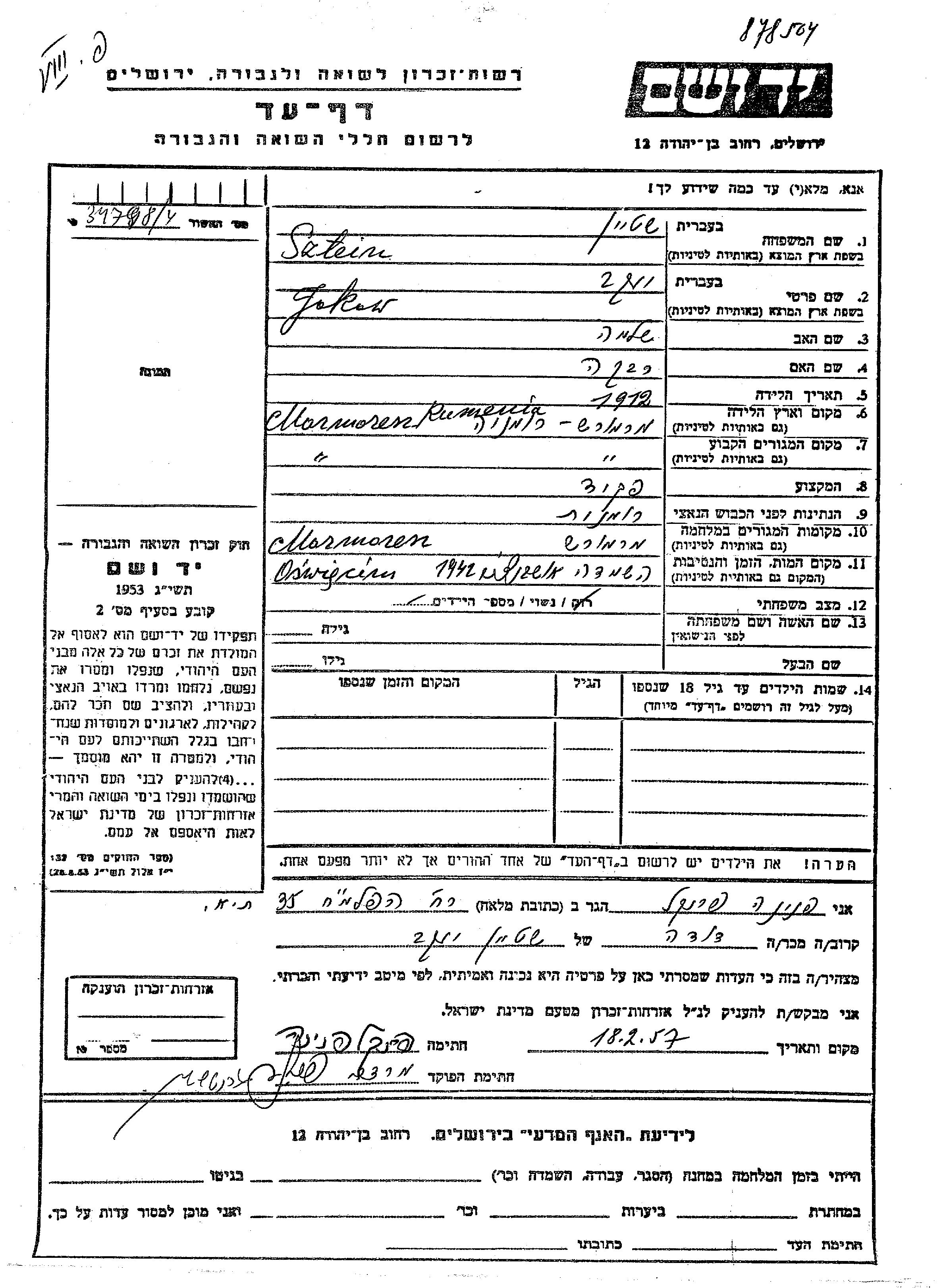 Sztein Jakow 1912 Marmoresh, Romania Page of Testimony