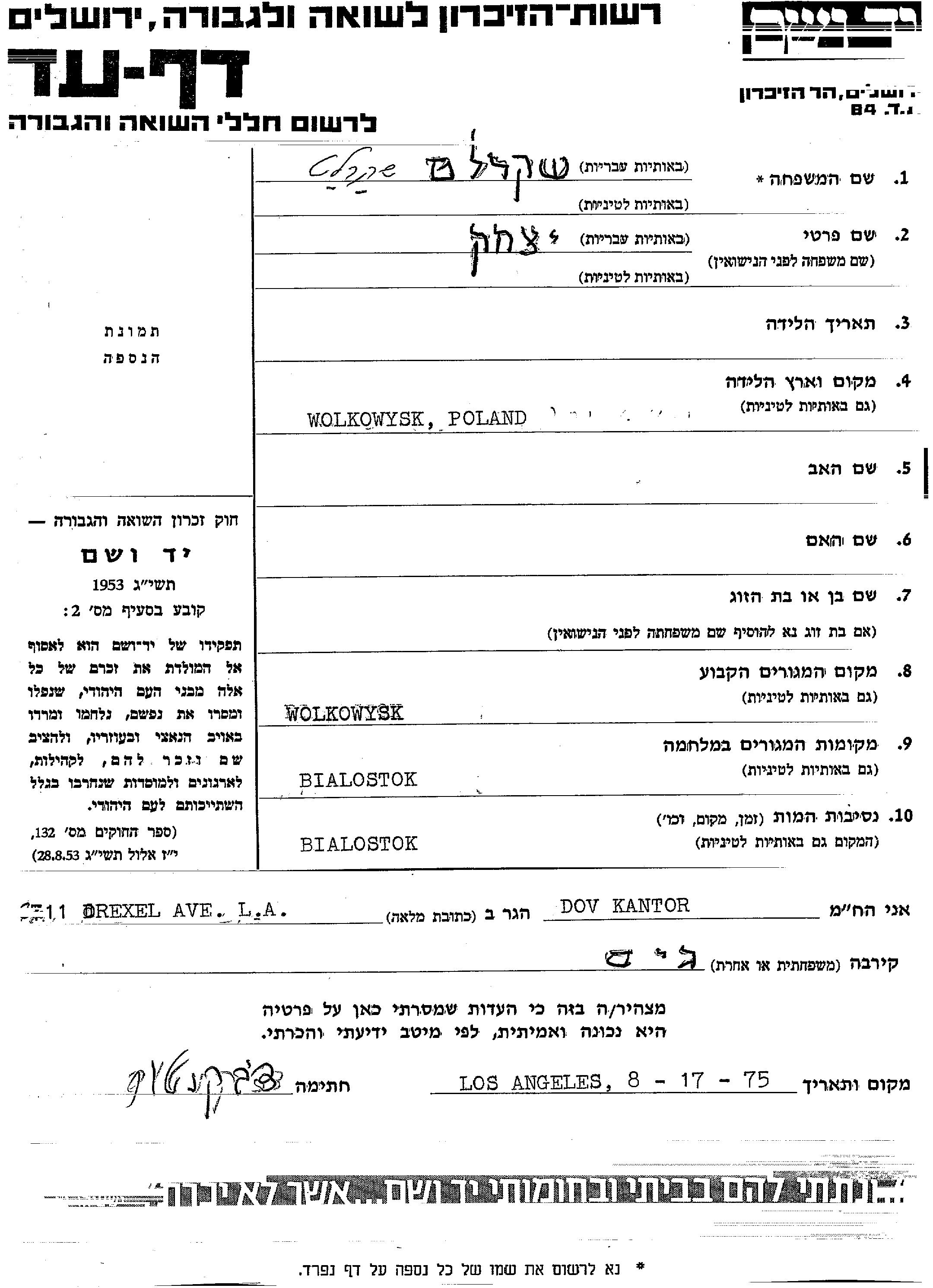Shkarlat Yitzkhak Wolkowisk, Poland Page of Testimony
