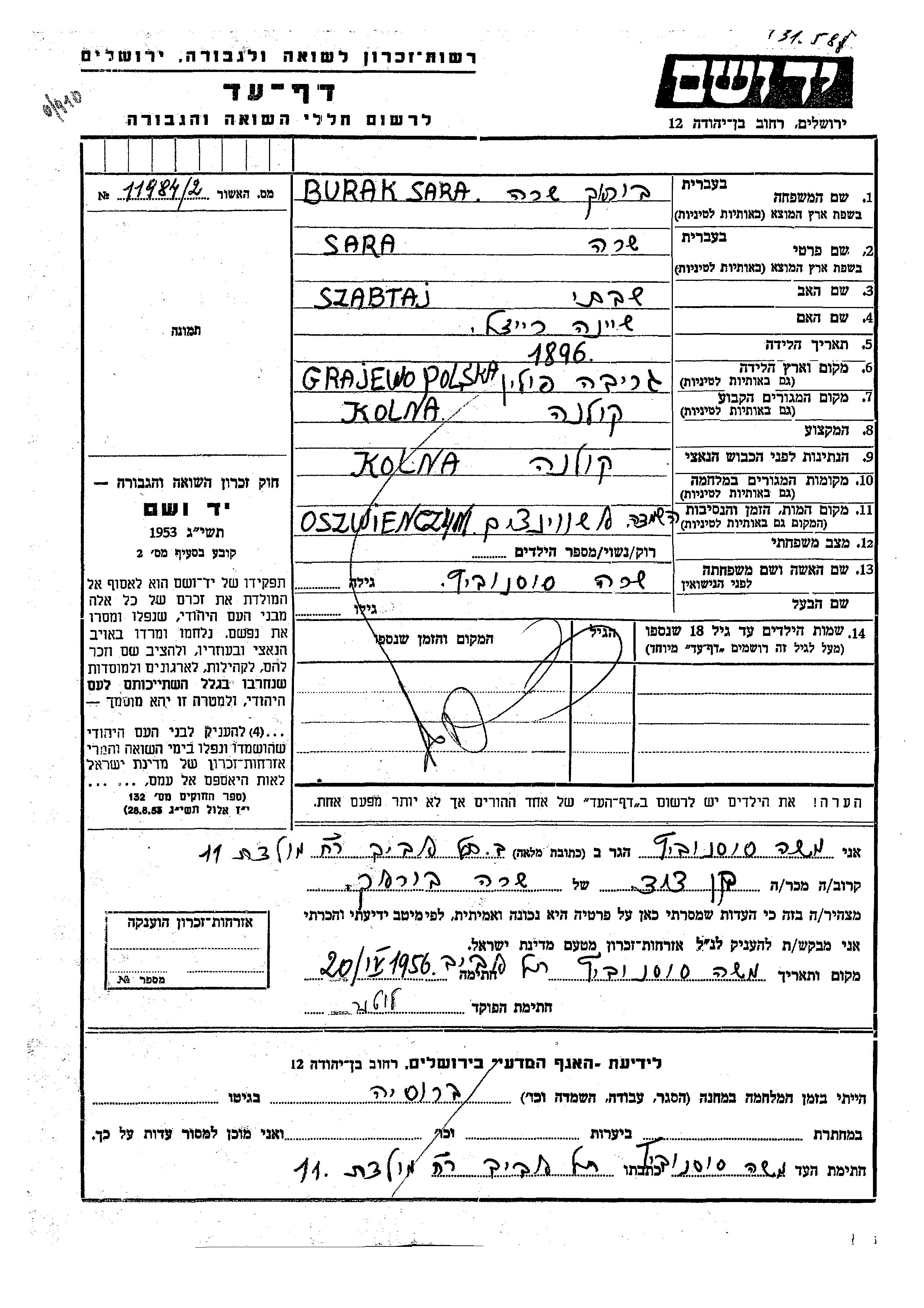Burak Sara 1896 Kolna, Poland Page of Testimony