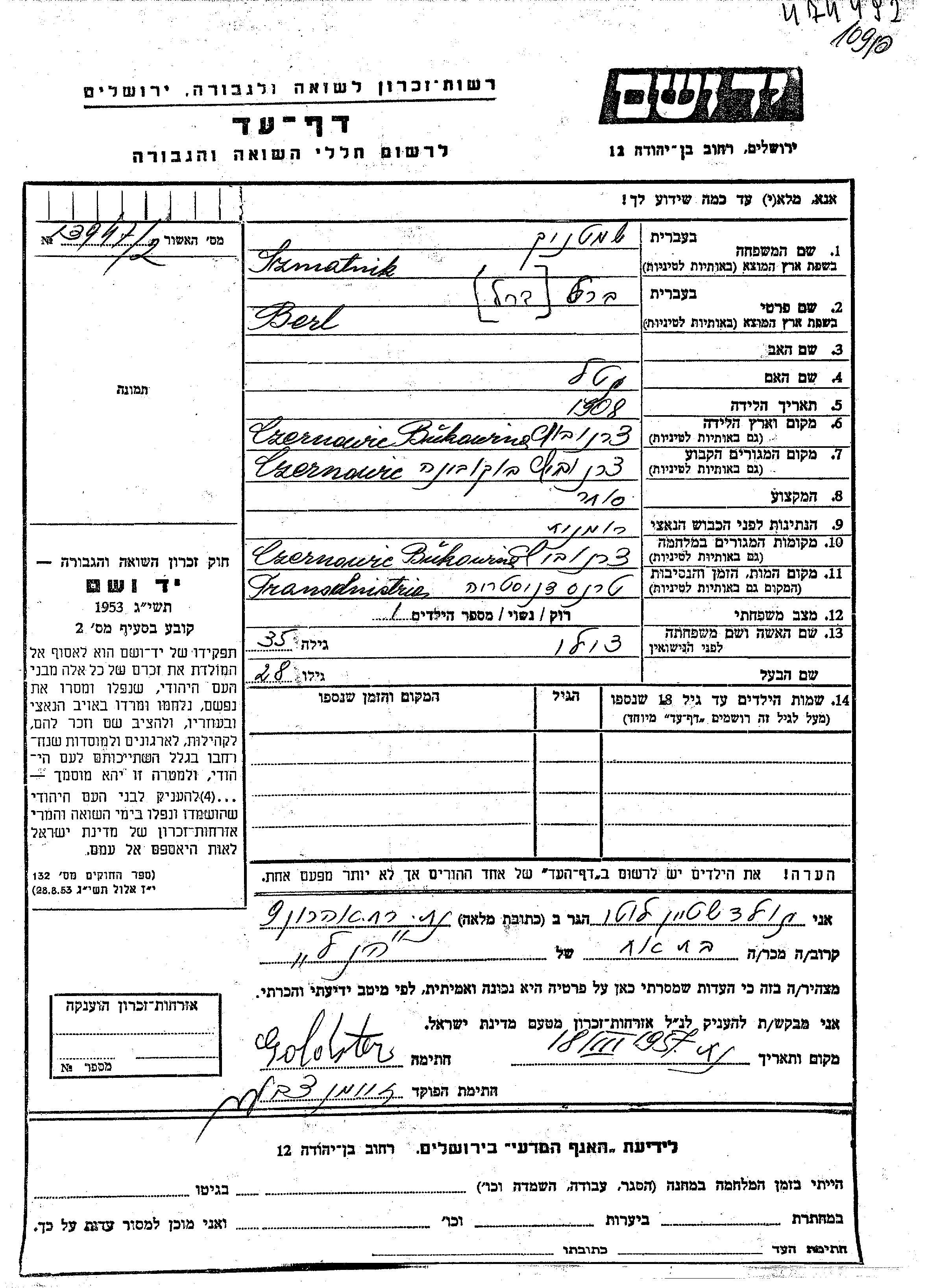 Szmatnik Berl 1908 Czernowiec, Romania Page of Testimony