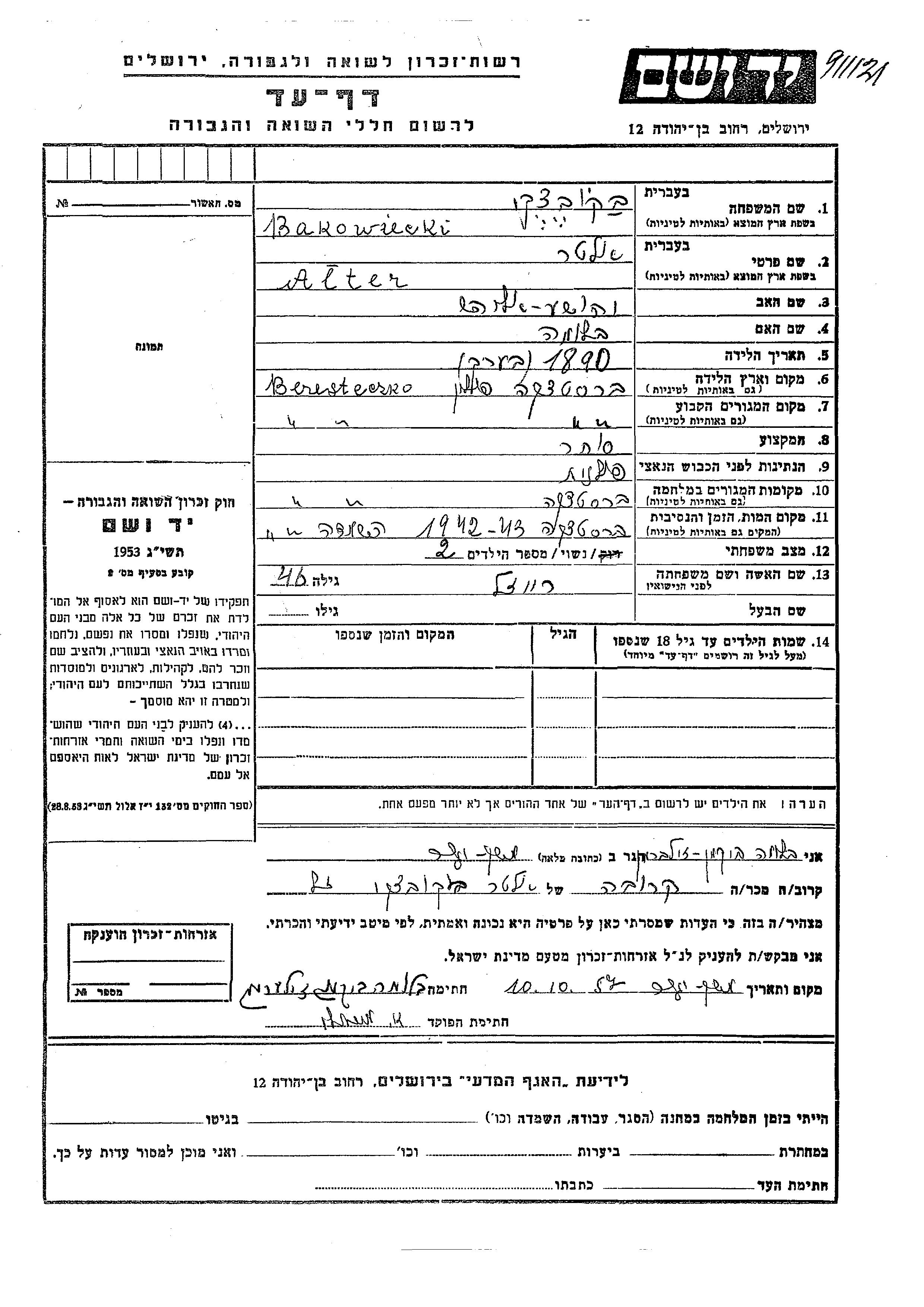 Alter Bakowiecki was born in Beresteczko, Poland, 1890 to Yehoshua Eliahu and Bluma. He was a merchant and married to Reizl. Prior to WWII he lived in Beresteczko, Poland. During the war he was in Beresteczko, Poland. Alter was murdered in the Shoah. Place of death: Beresteczko, Poland, 1942.