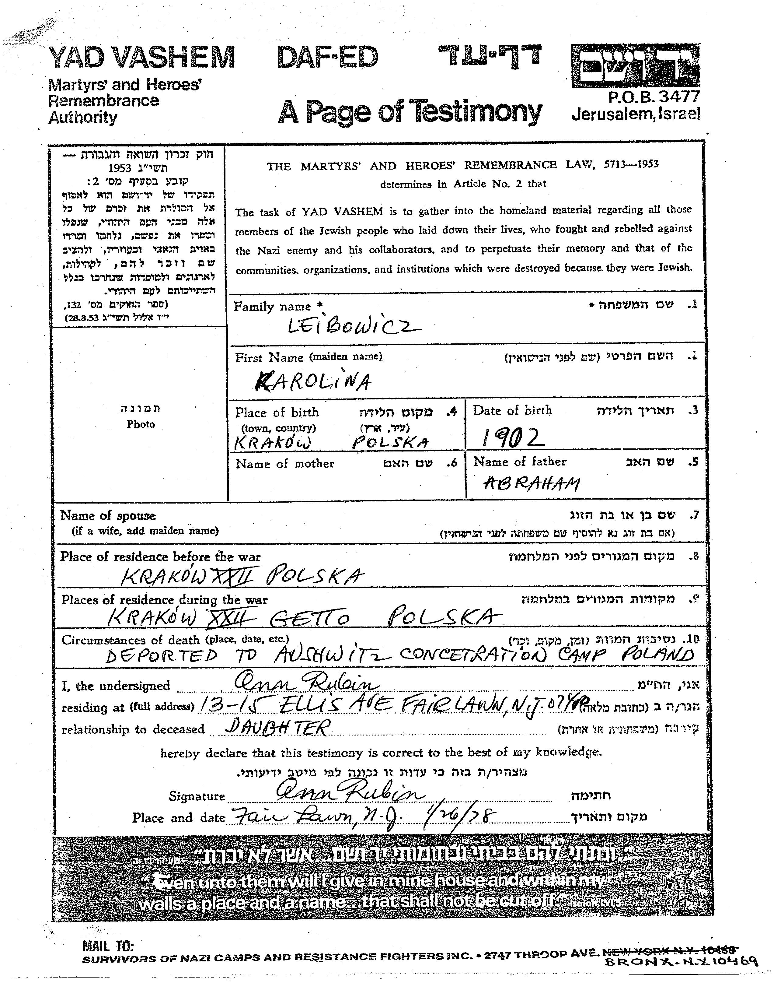 Leibowicz Karolina 1902 Krakow, Poland Page of Testimony