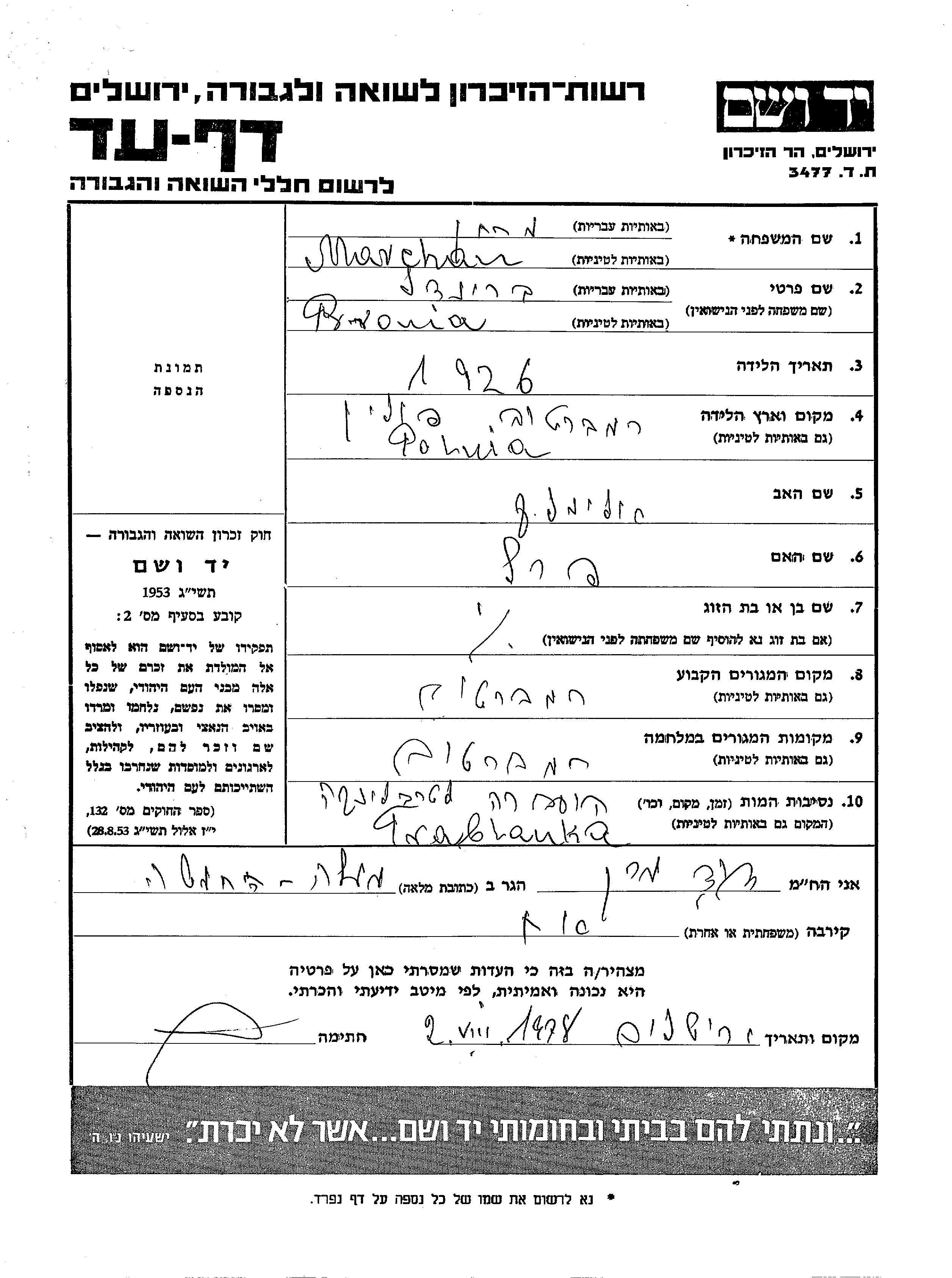 Bronia Breindl Marchan was born in Rembertow, Poland, 1926 to Elimelekh and Perel. Prior to WWII she lived in Rembertow, Poland. During the war she was in Rembertow, Poland. Bronia Breindl was murdered in the Shoah. Place of death: Treblinka, Poland.