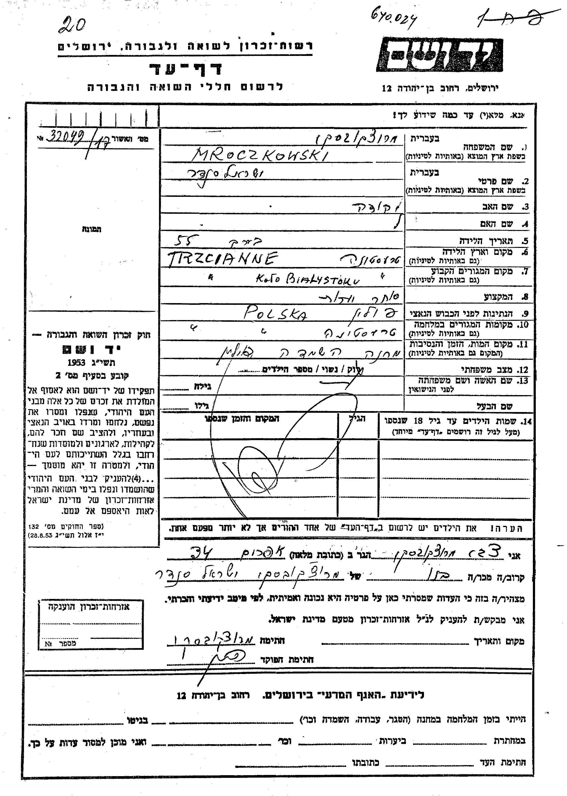 Yisrael Sender Mroczkowski was born in Trzcianne, Poland to Yehuda. He was a forest merchant and married. Prior to WWII he lived in Trzcianne, Poland. During the war he was in Trzcianne, Poland. Yisrael Sender was murdered in the Shoah. Place of death: Camp, Poland.
