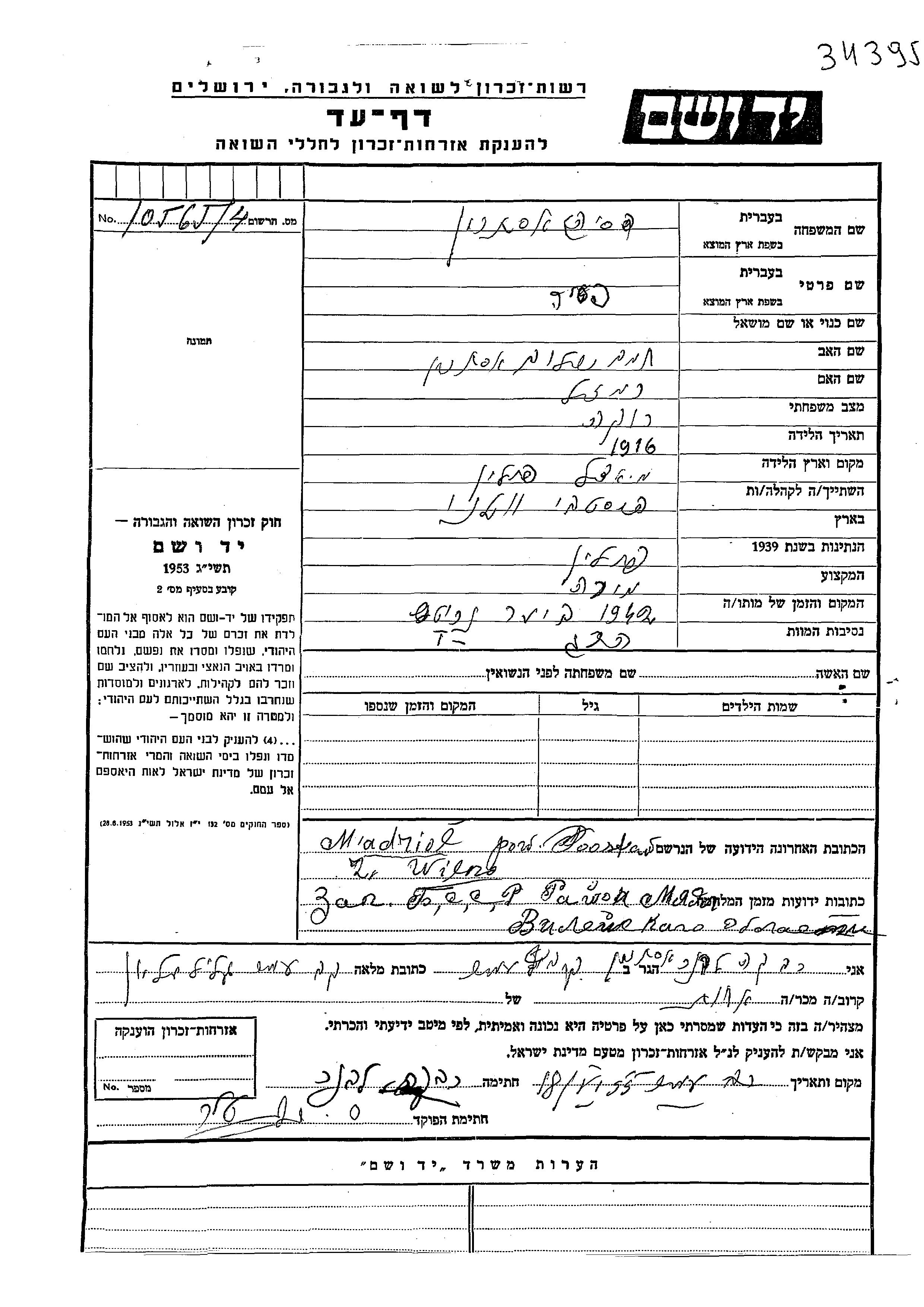 Yad Vashem - Pages of Testimony Names Memorial Collection