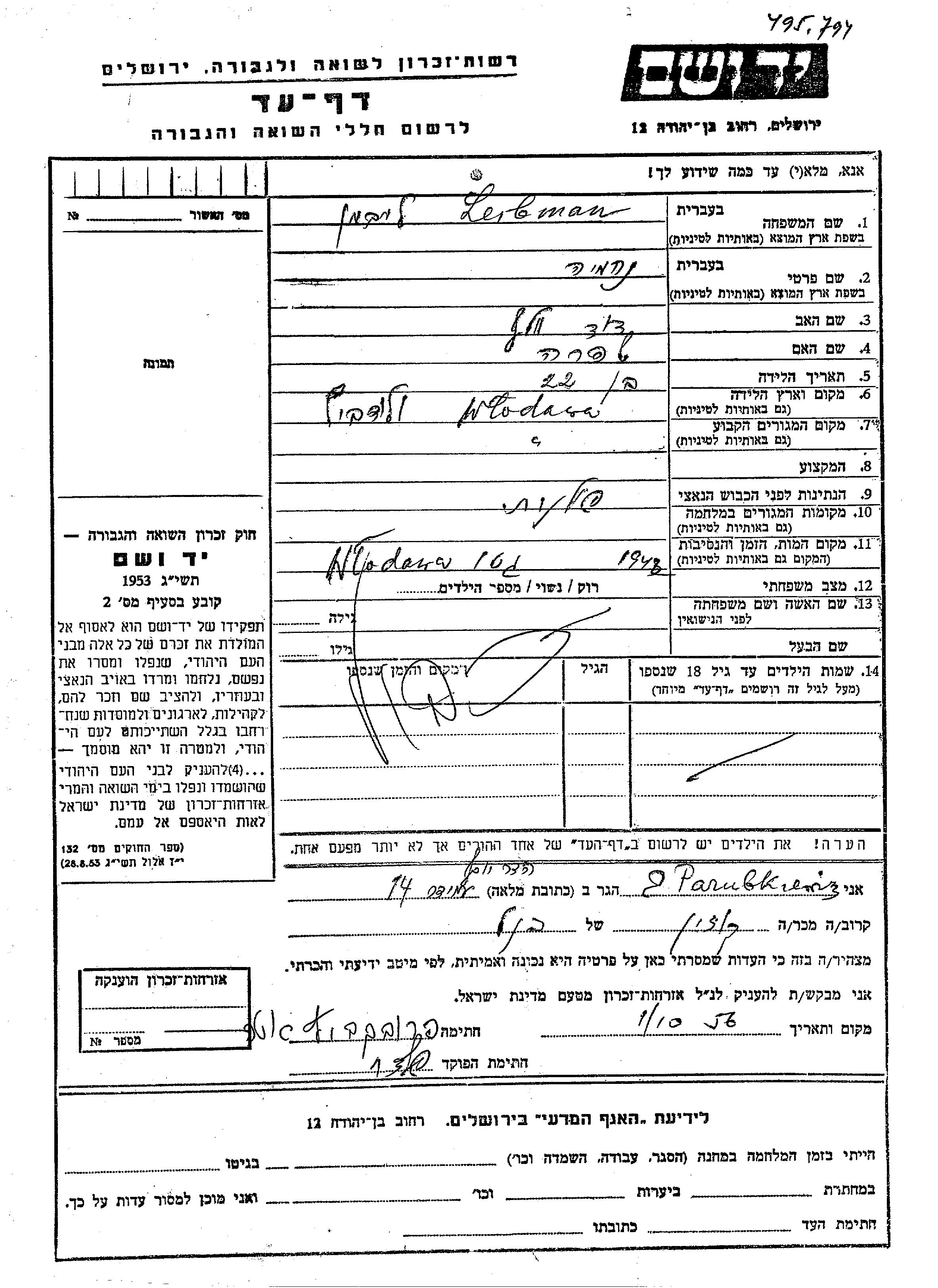 Nekhemia Leibman was born in Wlodowice, Poland to David Volf and Shifra. Prior to WWII he lived in Wlodowice, Poland. Nekhemia was murdered in the Shoah. Place of death: Wlodowice, Poland, 1943.