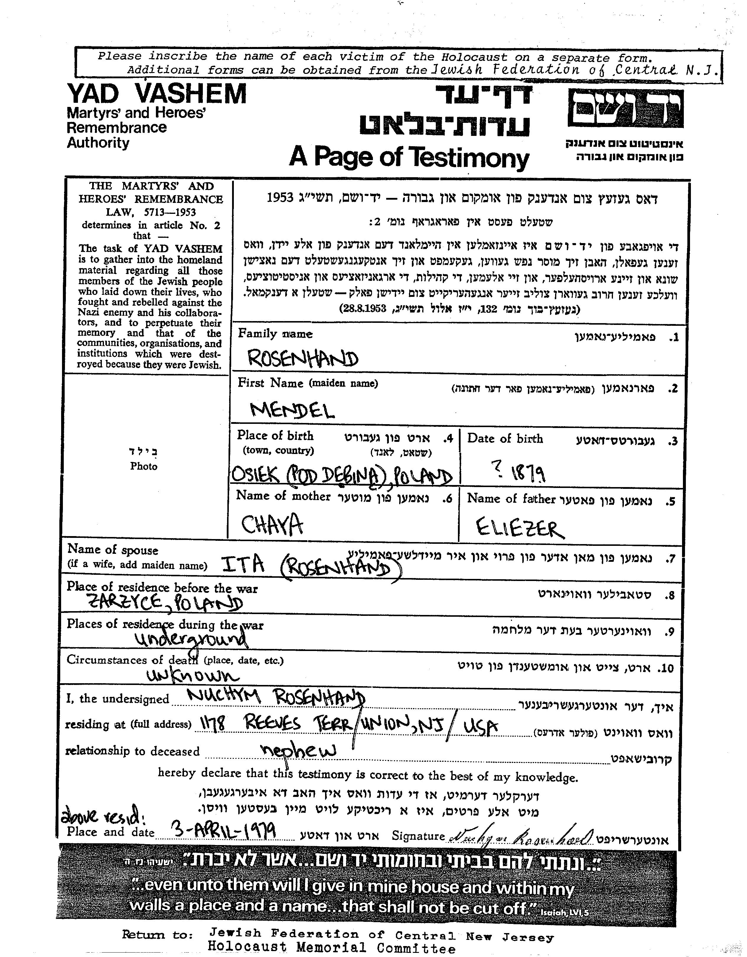 Rosenhand Mendel 1879 Zarzyce, Poland Page of Testimony