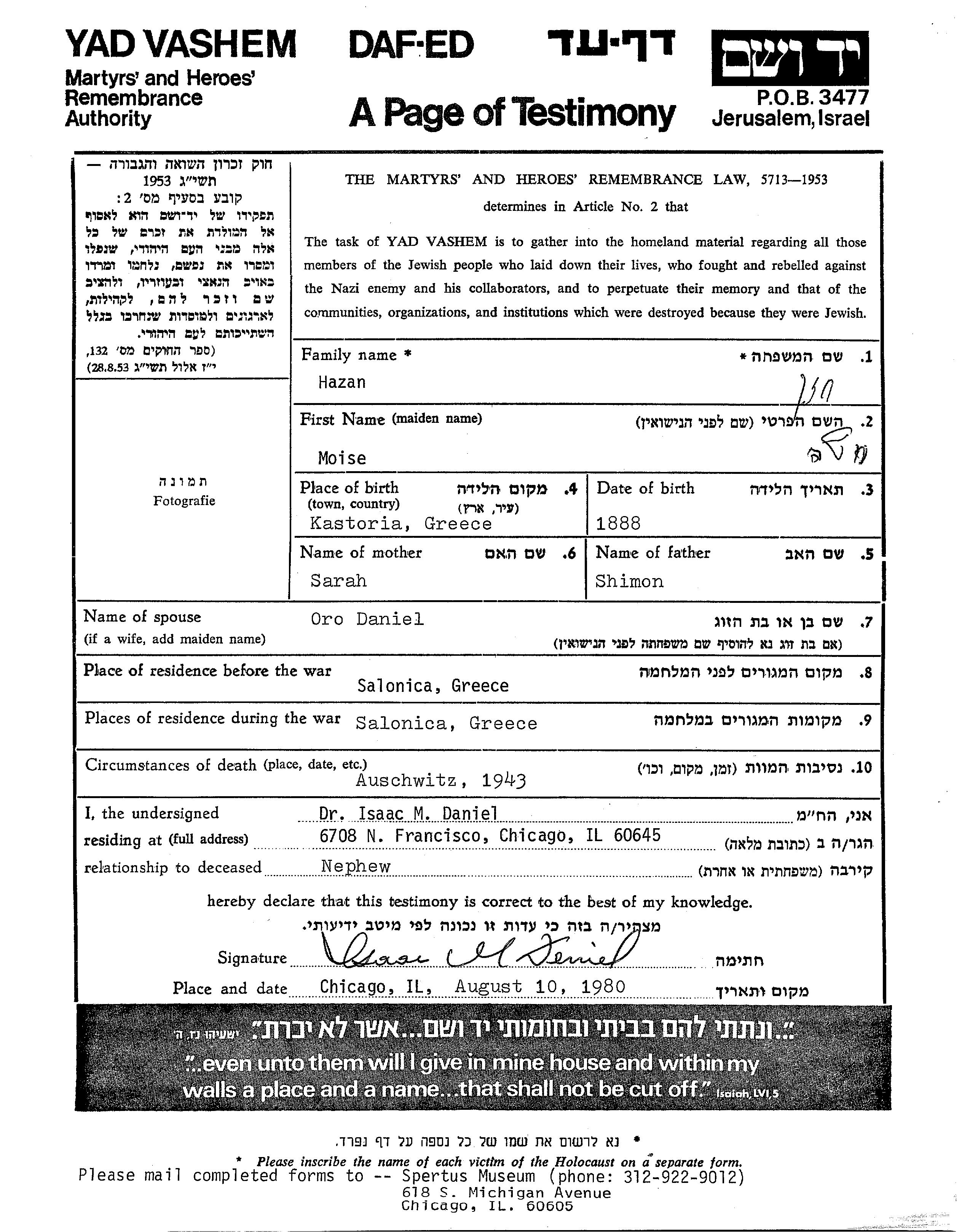 Hazan Moise 1888 Salonika, Greece Page of Testimony