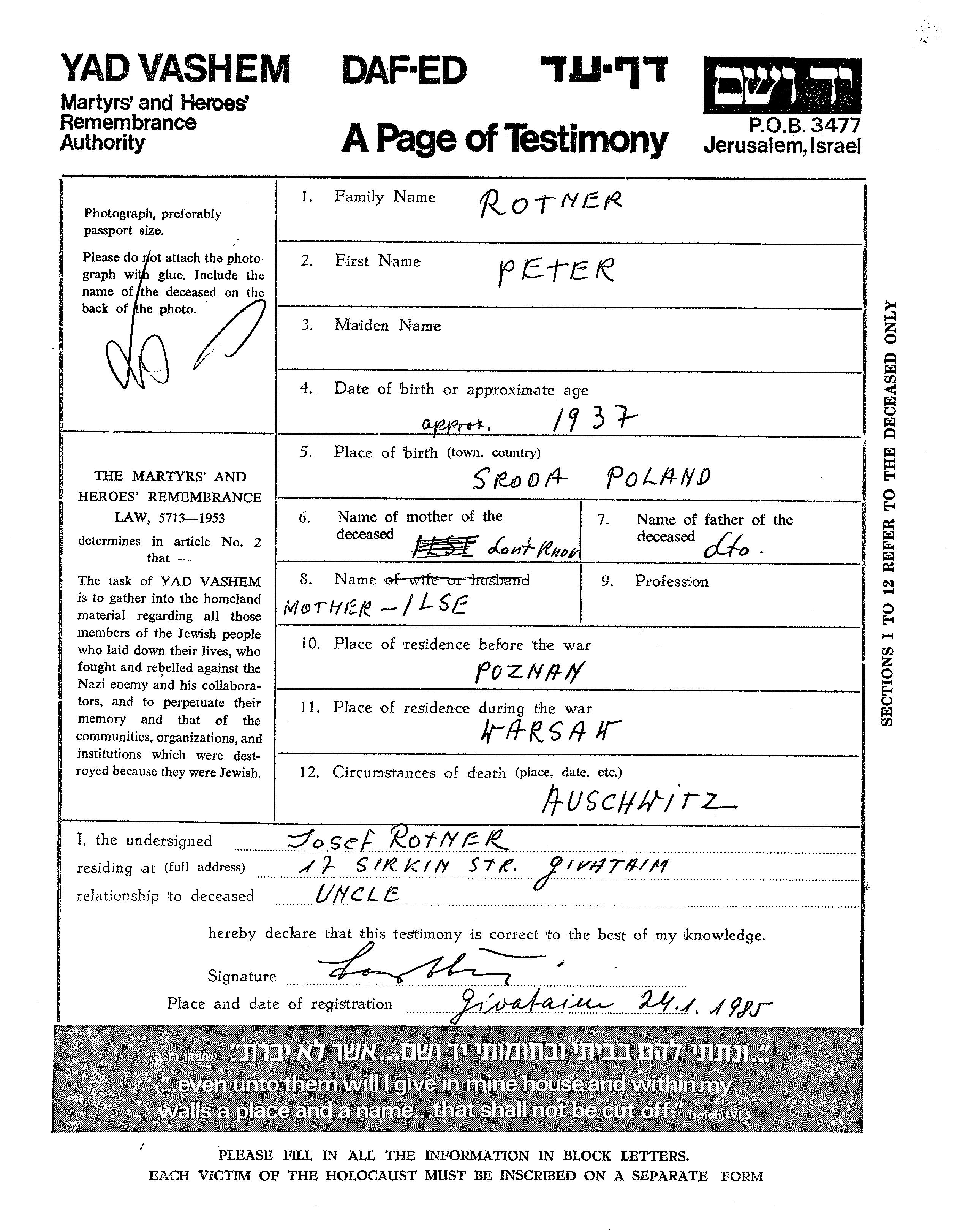 Peter Rotner was born in Sroda, Poland, 1937 to Ilse. He was single. Prior to WWII he lived in Poznan, Poland. During the war he was in Warszawa, Poland. Peter was murdered in the Shoah. Place of death: Auschwitz, Poland.