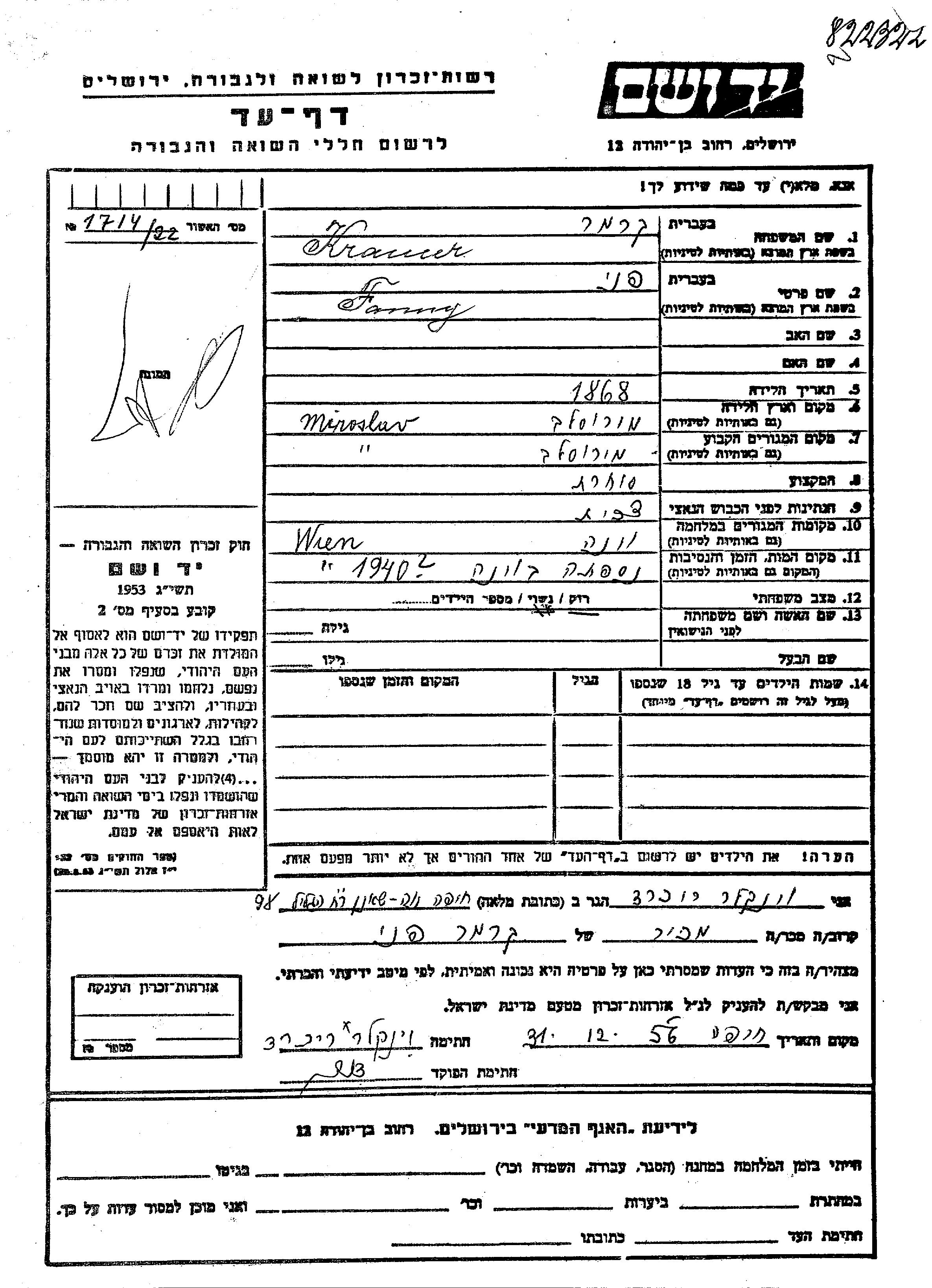 Fanny Kramer was born in Miroslavas, Lithuania, 1868. She was a merchant and single. Prior to WWII she lived in Miroslavas, Lithuania. During the war she was in Wien, Austria. Fanny was murdered in the Shoah. Place of death: Wien, Austria, 1940.